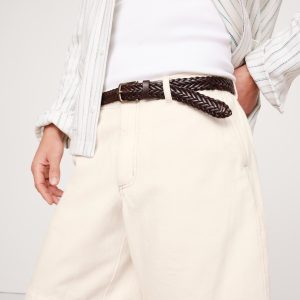 Zip fly with button closure. Belt loops.