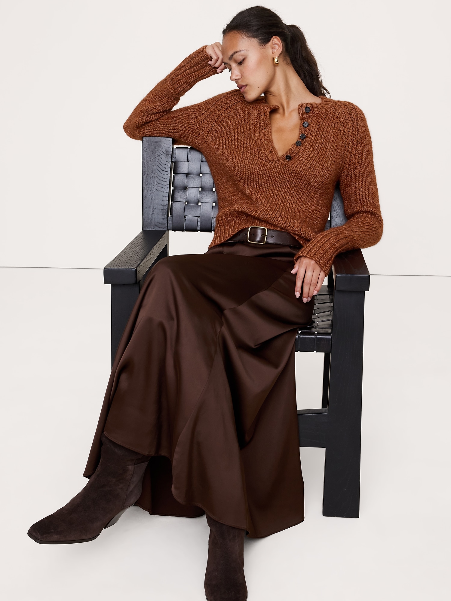 Team Henley. This vintage-inspired sweater is crafted from a chunky yarn spun of cotton, luxurious alpaca, and warm Merino wool, in a fitted silhouette.