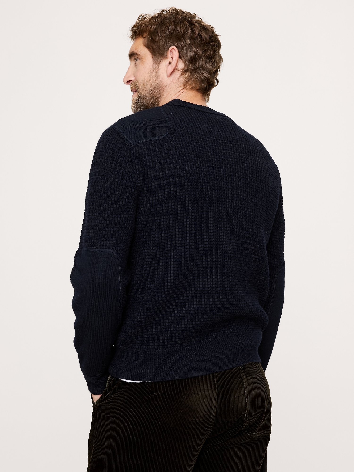 A utilitarian twist on the classic waffle-knit sweater, this one is knitted in soft cotton and warm Merino wool with patch details at the shoulders and arms.