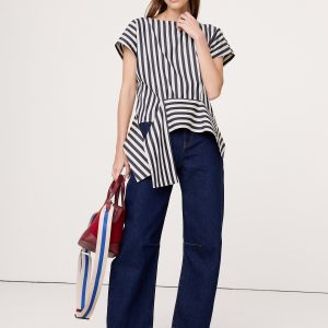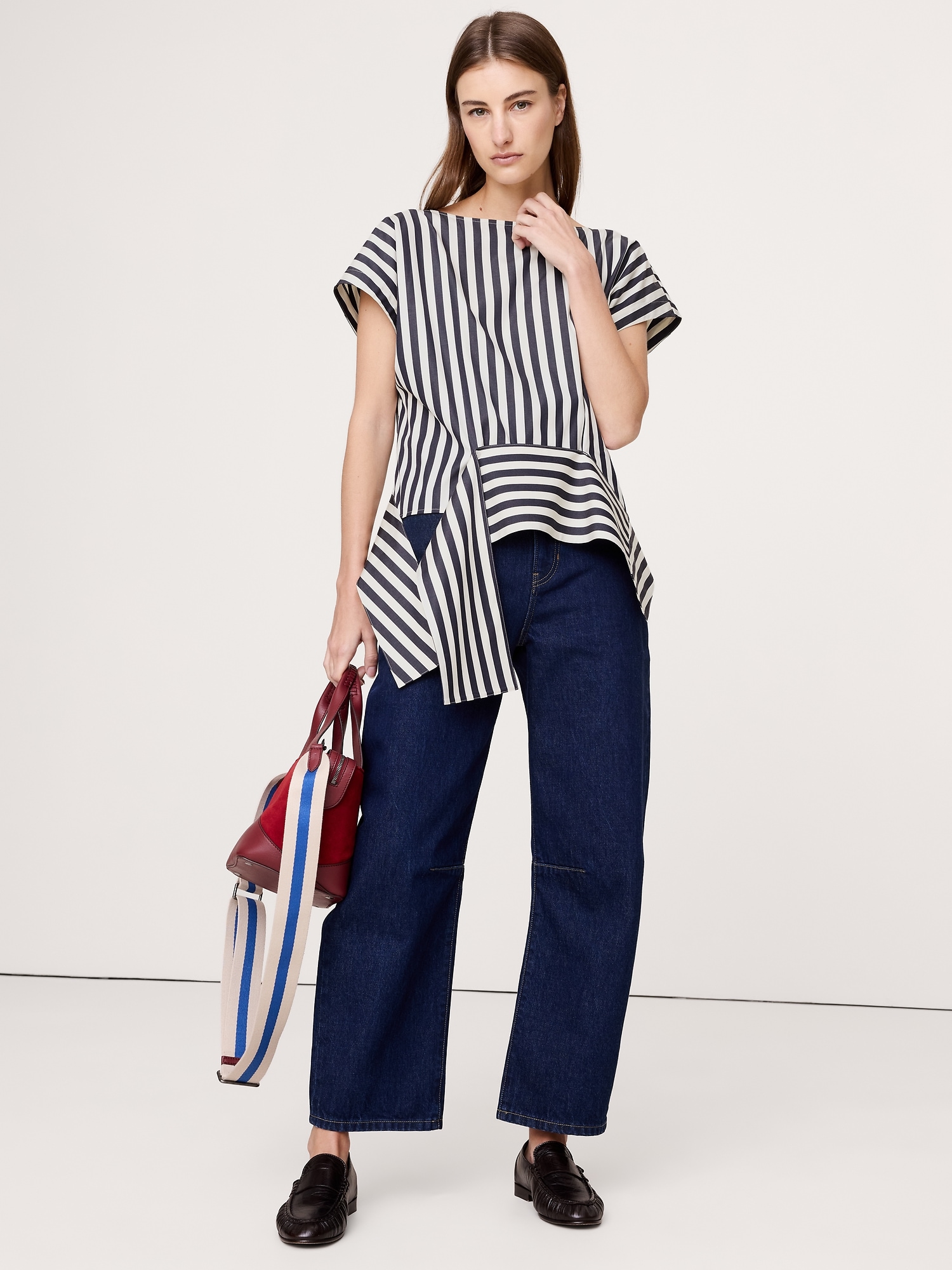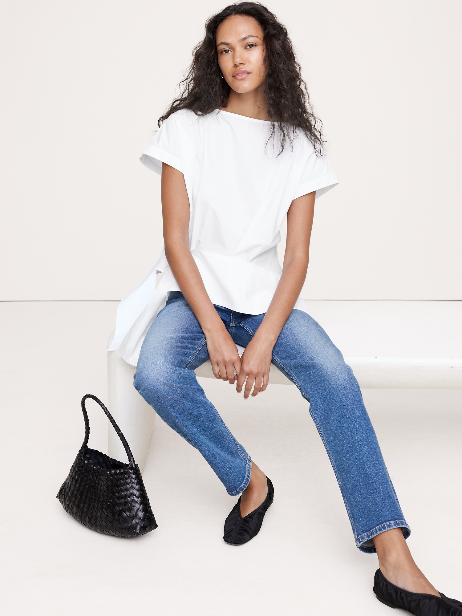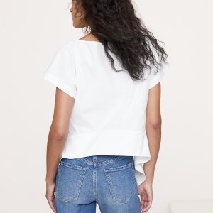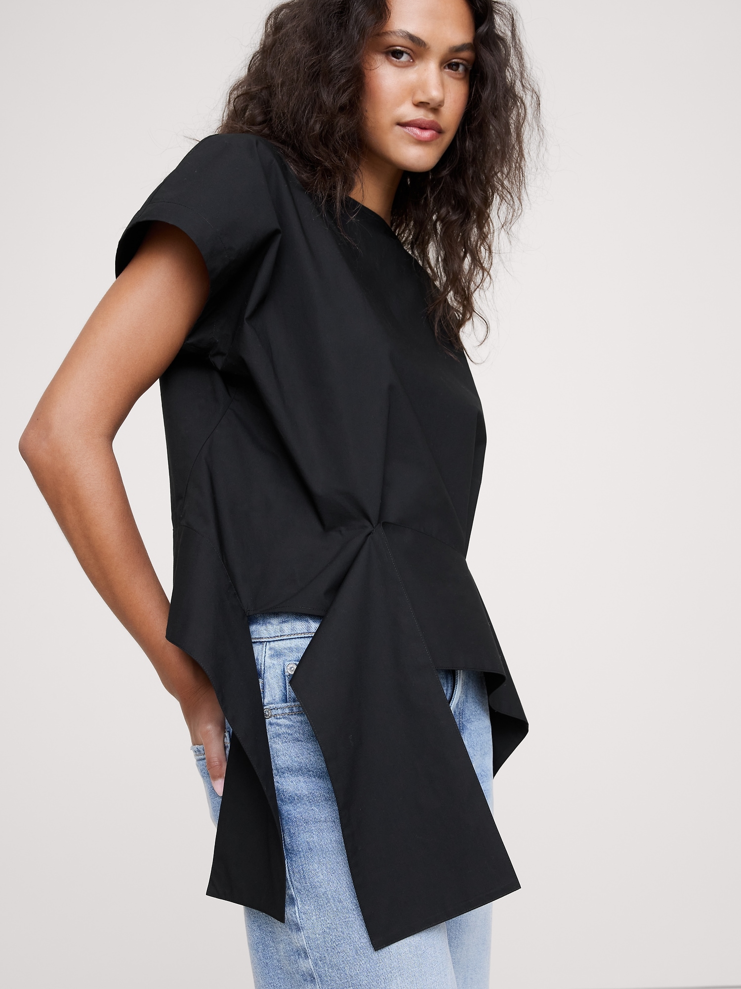 Deconstructed, reconstructed. This cotton poplin shirt borrows elements from the classic shirt, with a boatneck and asymmetrical hem twist. Let the bottom sash down or tie at the side to cinch the waist. Relaxed fit: Relaxed fit through shoulders, chest and waist. Boatneck. Button detail and asymmetrical hem. Unlined. #825954