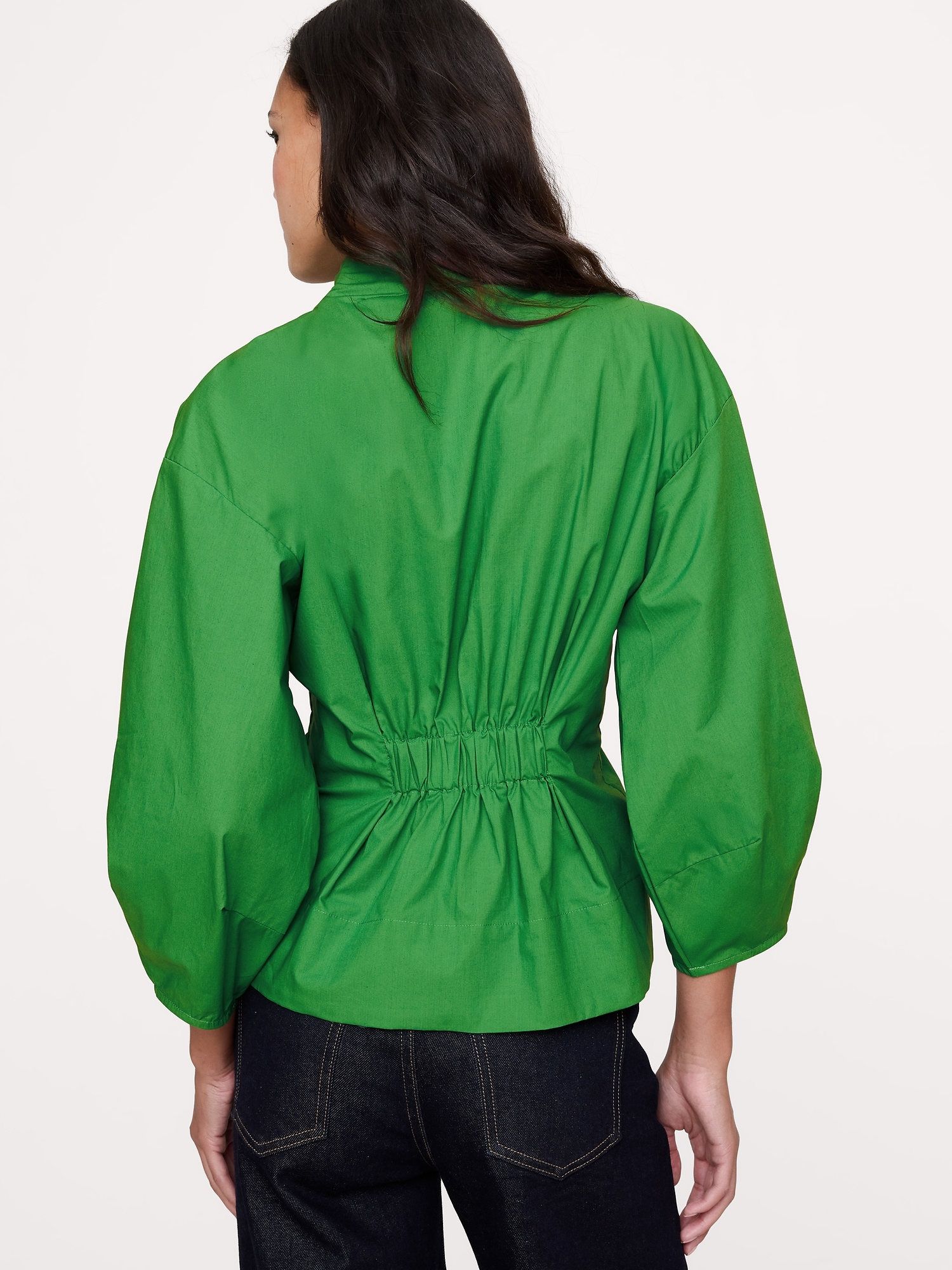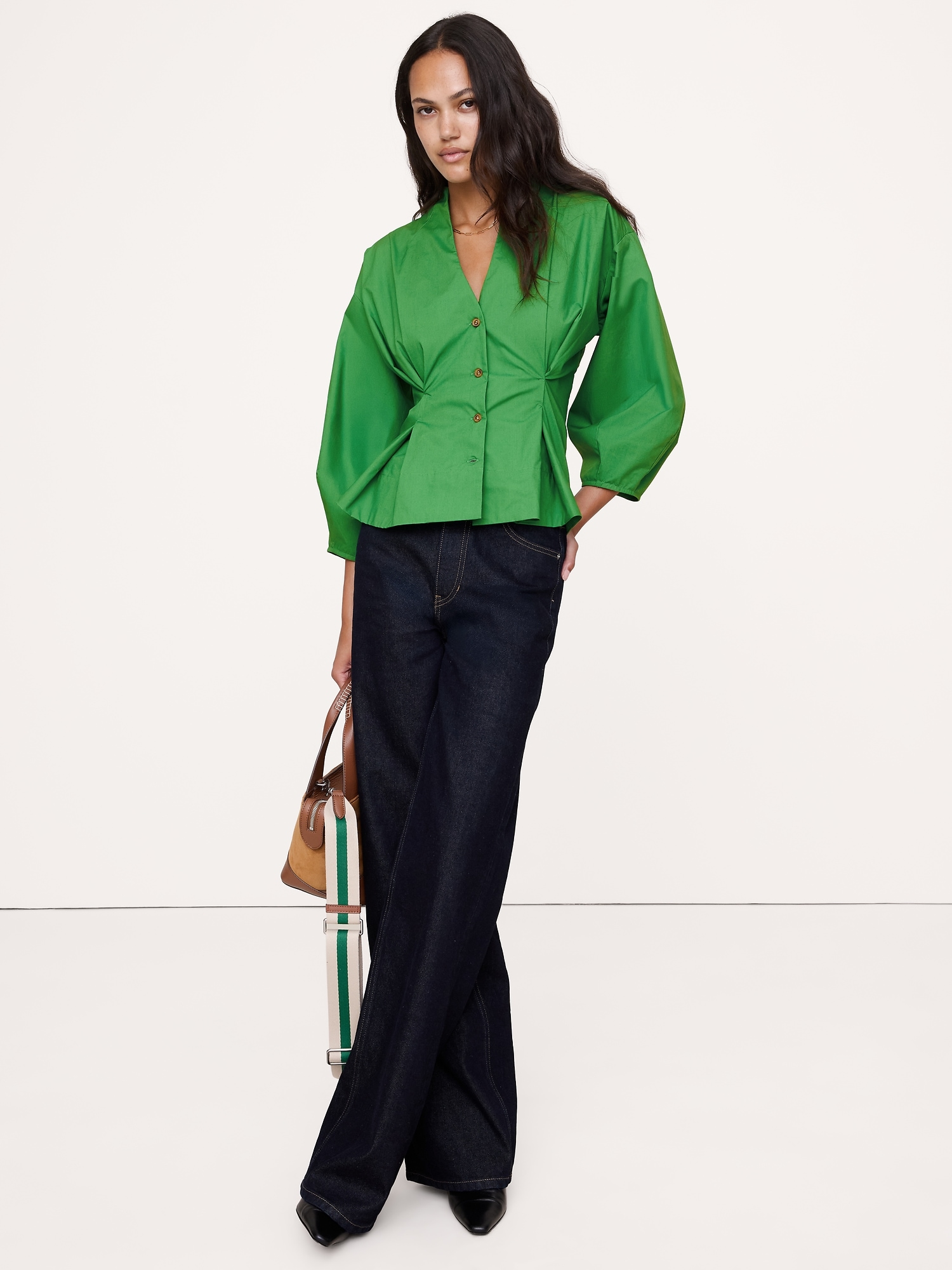 A fun and flirty take on the classic poplin shirt, this one has blouson sleeves here, as well as pleats at the waist and a cinched detail at back. Relaxed fit through shoulders, arms, and chest. Fitted waist and peplum hem. V-neck with button front. Cinched detail at back waist. Unlined. #833064