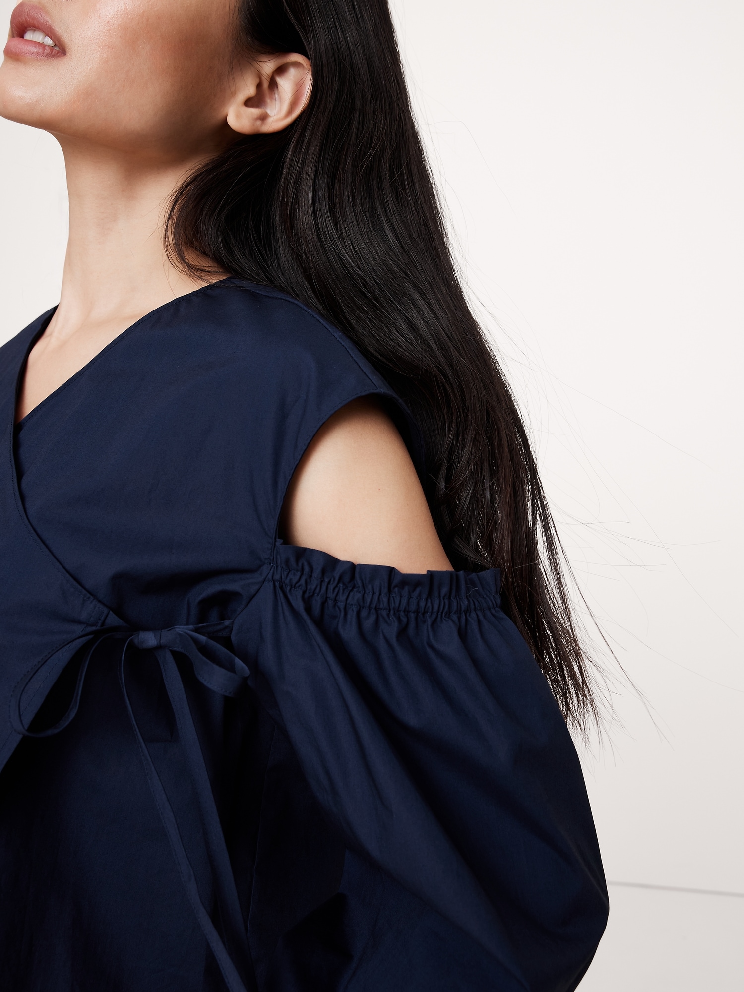 We cut this easy top with a wrap front and cut-out details—in our premium 100% cotton poplin. Relaxed fit: Relaxed fit through shoulders, chest and waist. V-neck with tie front closure. Elastic cuffs. Unlined. #770274