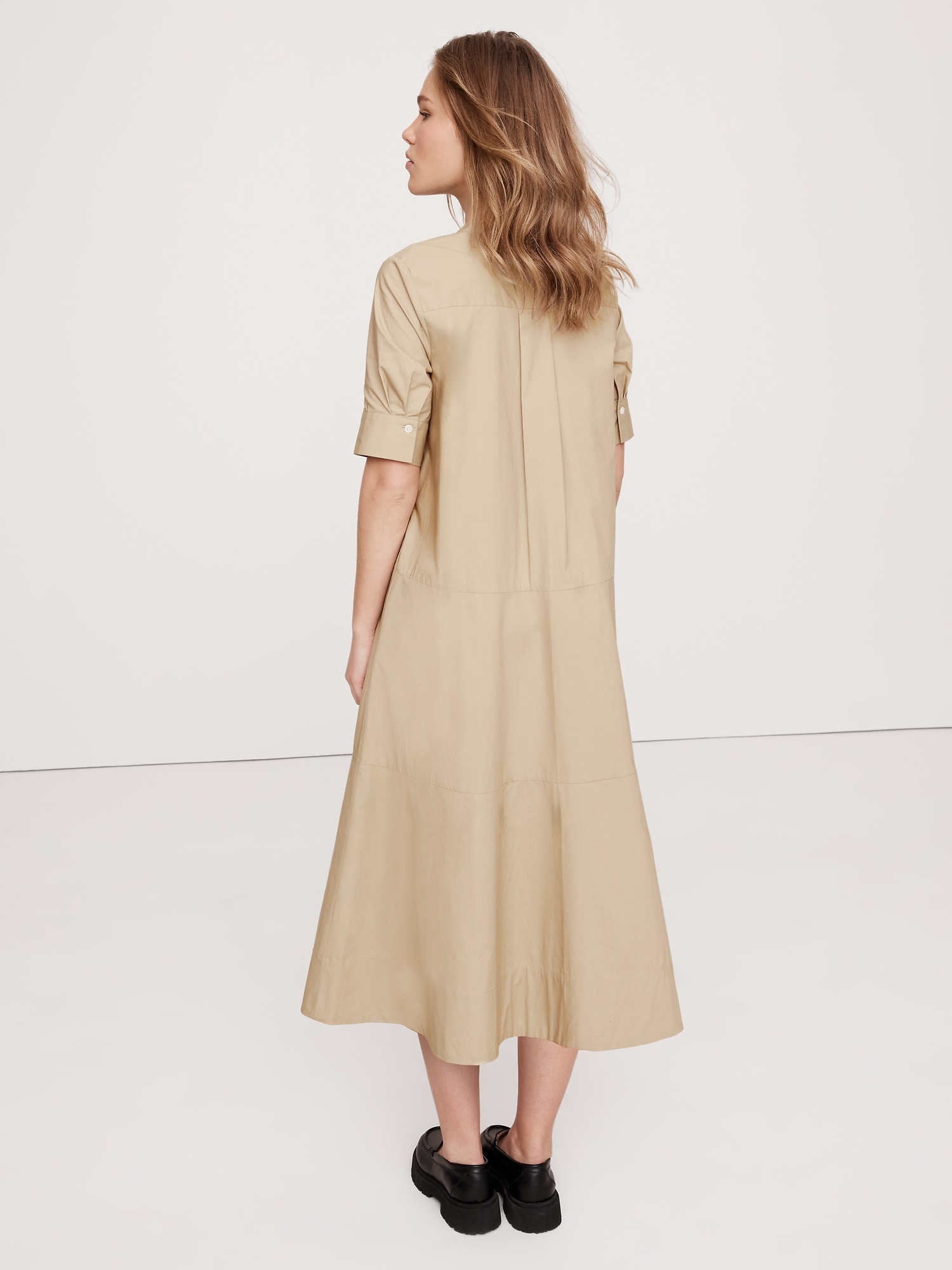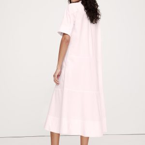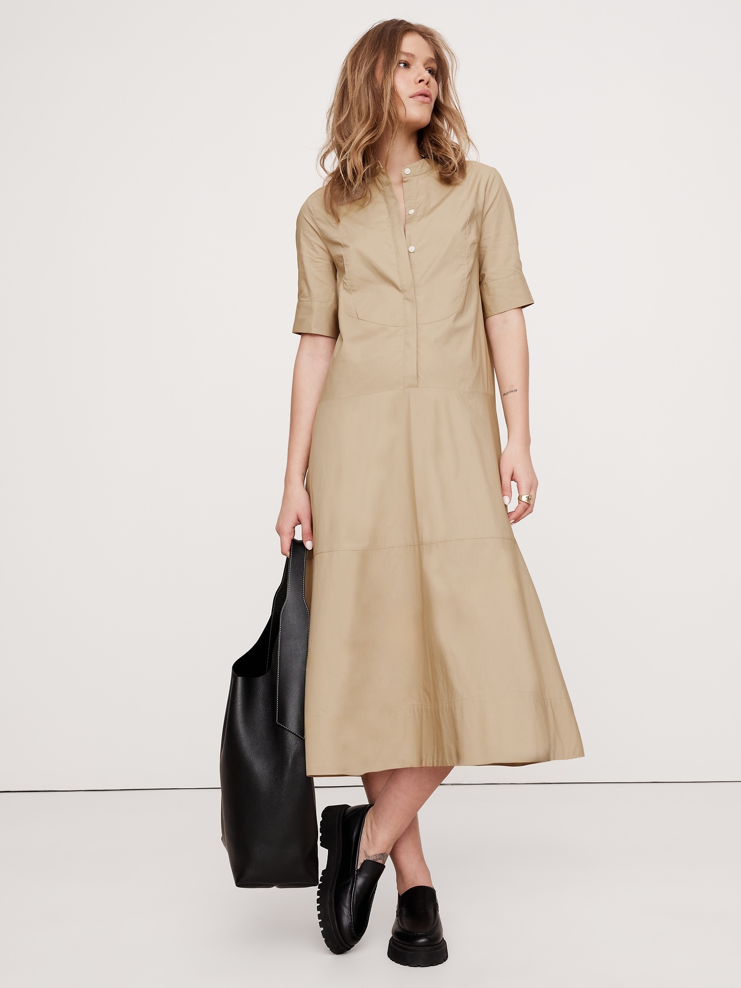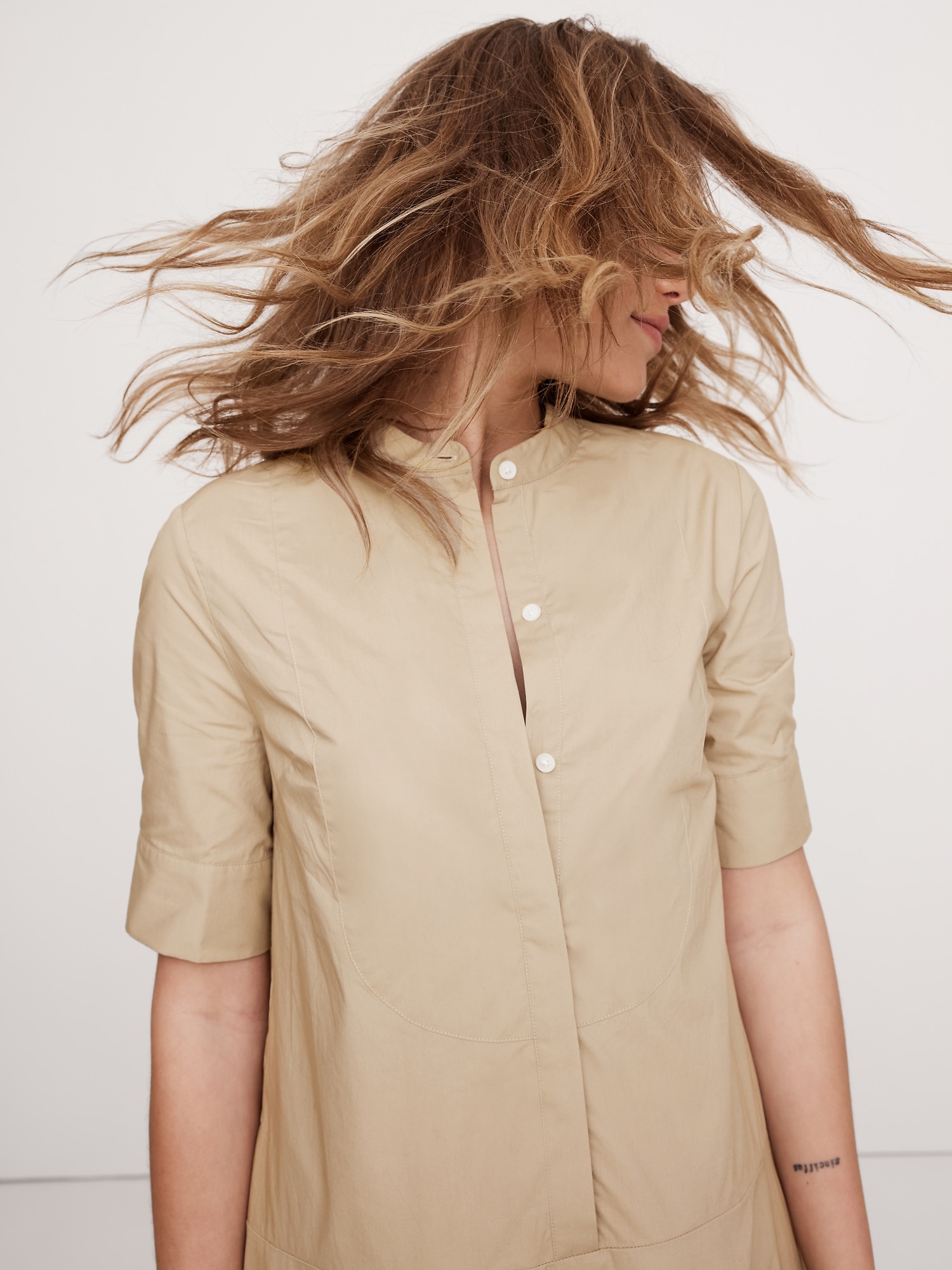Bring on the sunshine. This is a relaxed shirt dress with a tuxedo-style front panel detail at the bodice, a tiered skirt, and an extra wide hem to add a little flounce.