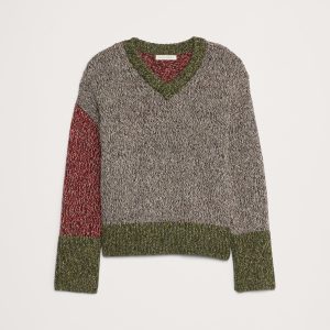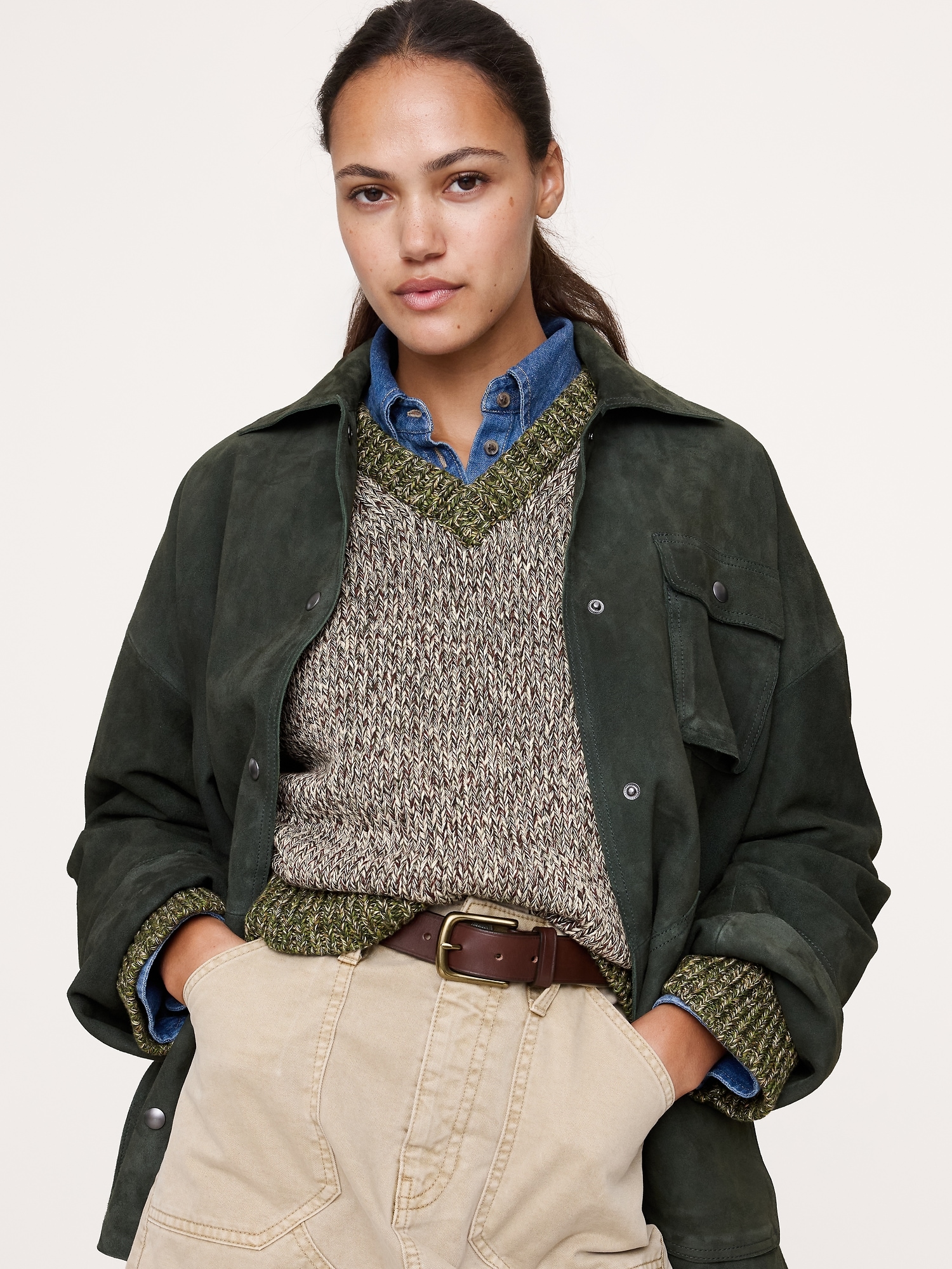 We modeled this classic v-neck sweater after a vintage one we found in our archives. We knitted it in our chunky cotton yarn, borrowing the high v-neckline from the original and opting for an oversized silhouette to make it modern.
