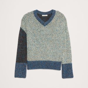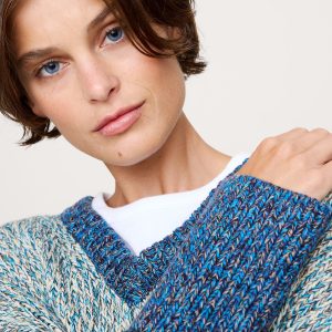 We modeled this classic v-neck sweater after a vintage one we found in our archives. We knitted it in our chunky cotton yarn, borrowing the high v-neckline from the original and opting for an oversized silhouette to make it modern.