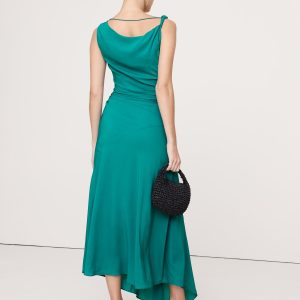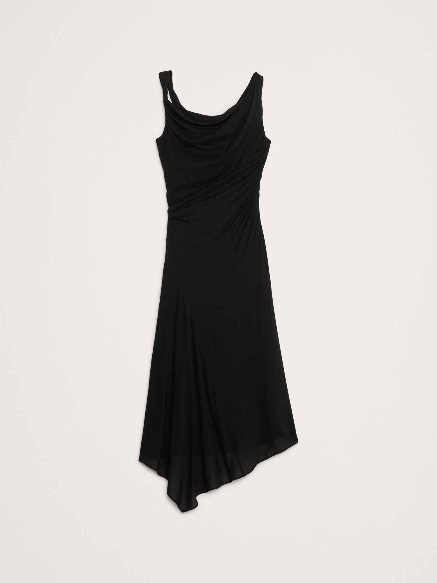 An architectural take on the 90s slip-dress, cut from a viscose crepe that feels light-as-chiffon with a subtle stretch. A twisted shoulder detail, ruching at the side, and bias-cut panels enhance its fit-and-flare silhouette.