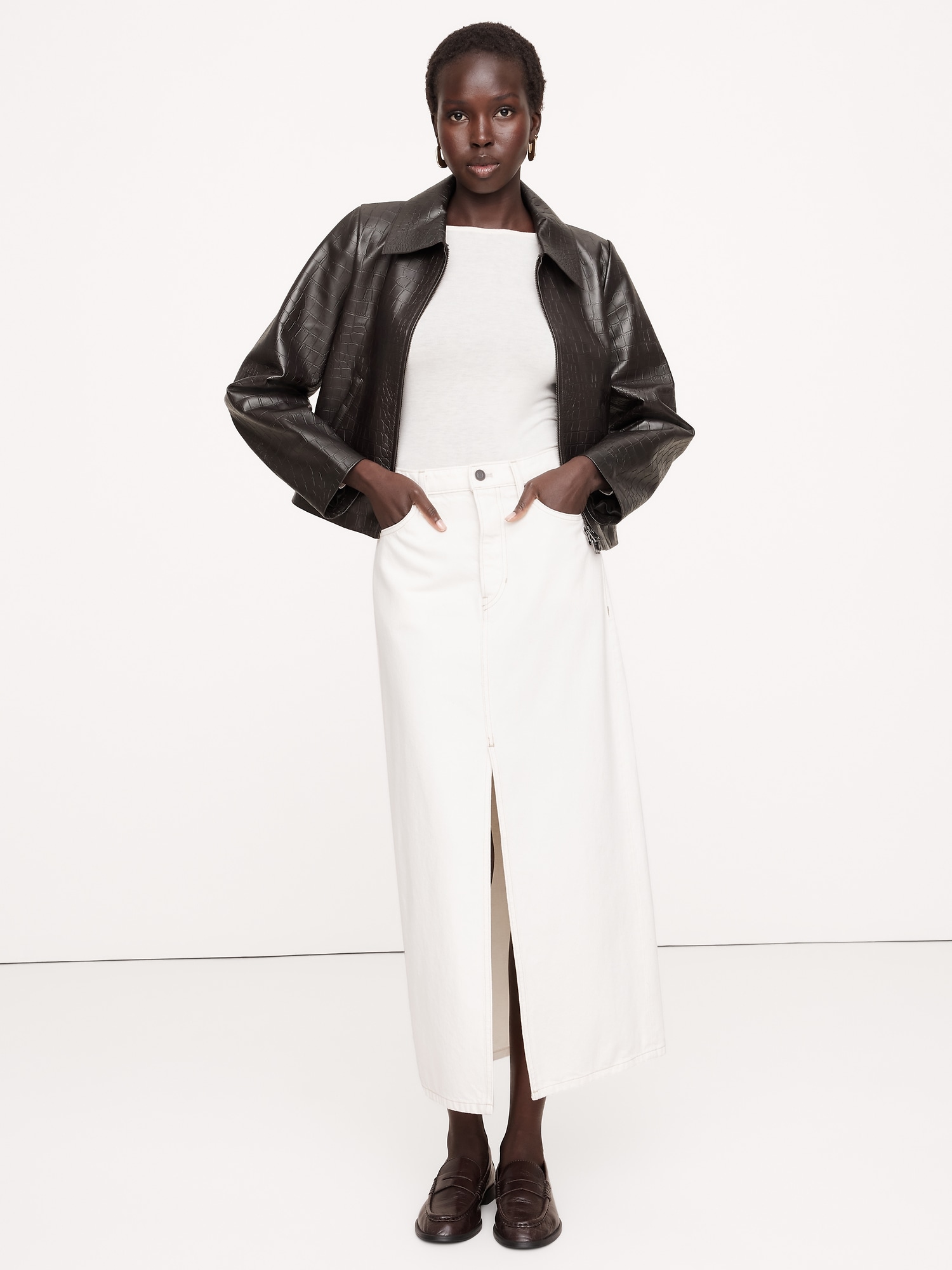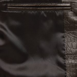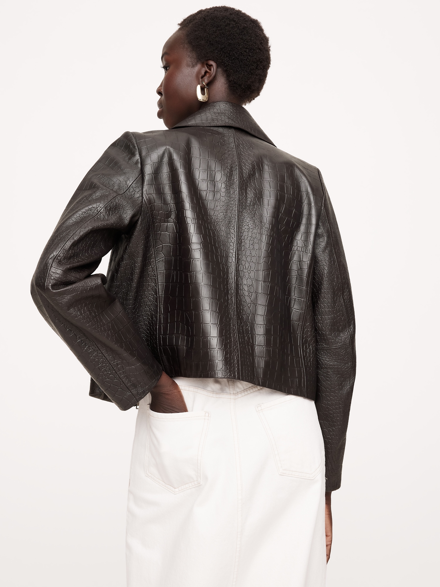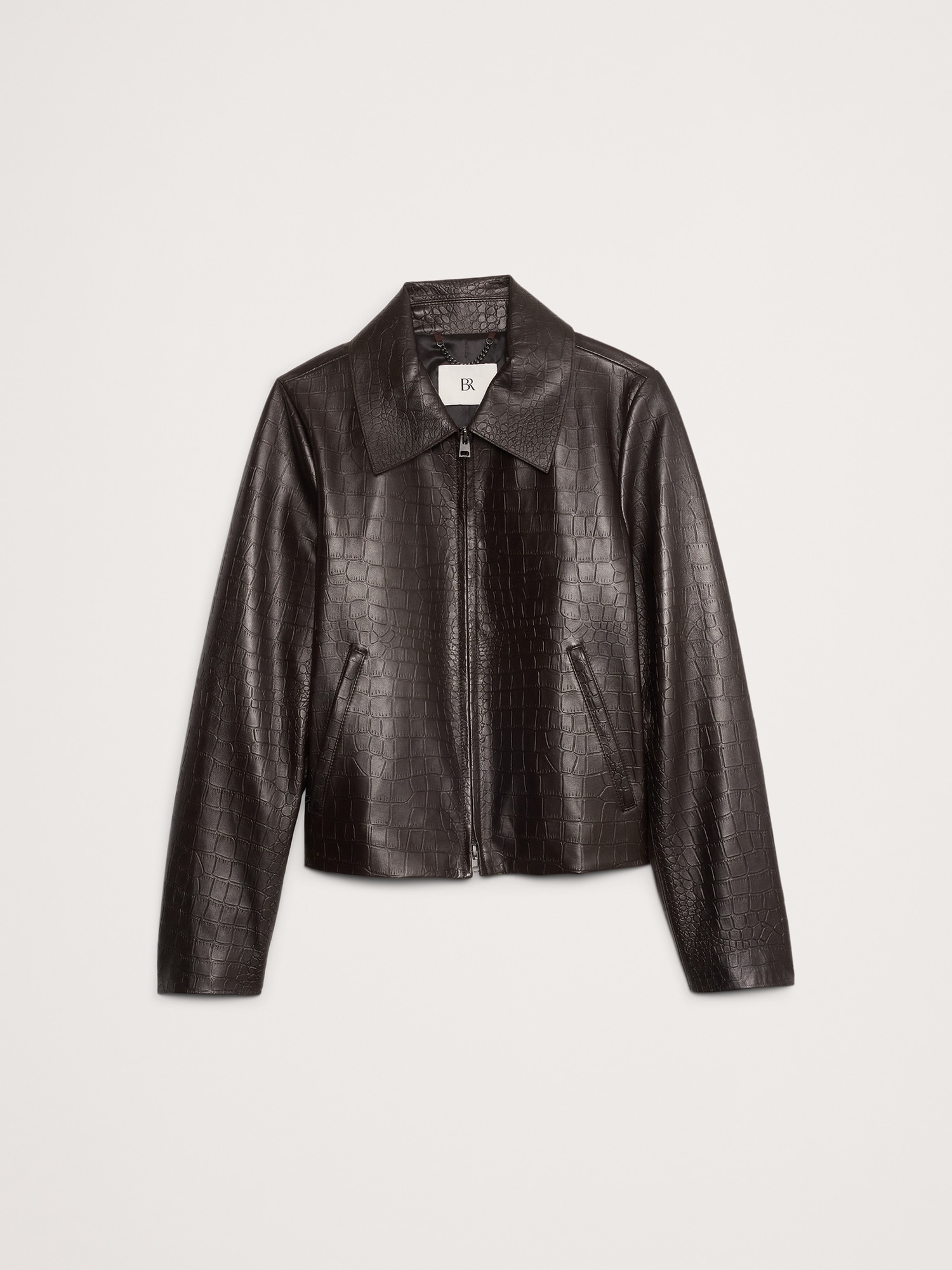 Look closely: this sleek leather jacket is cut from a luxurious leather quality that has been embossed to mimic the look and feel of crocodile. Here, we showcase this beautiful material in a classic, minimalist silhouette with a two-way zip front and point collar to give this style the retro, utilitarian vibe of a garage jacket.
