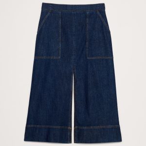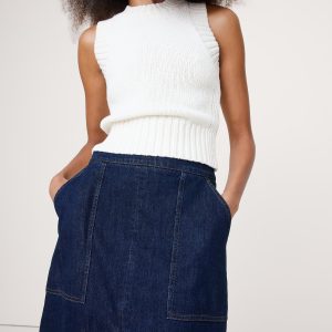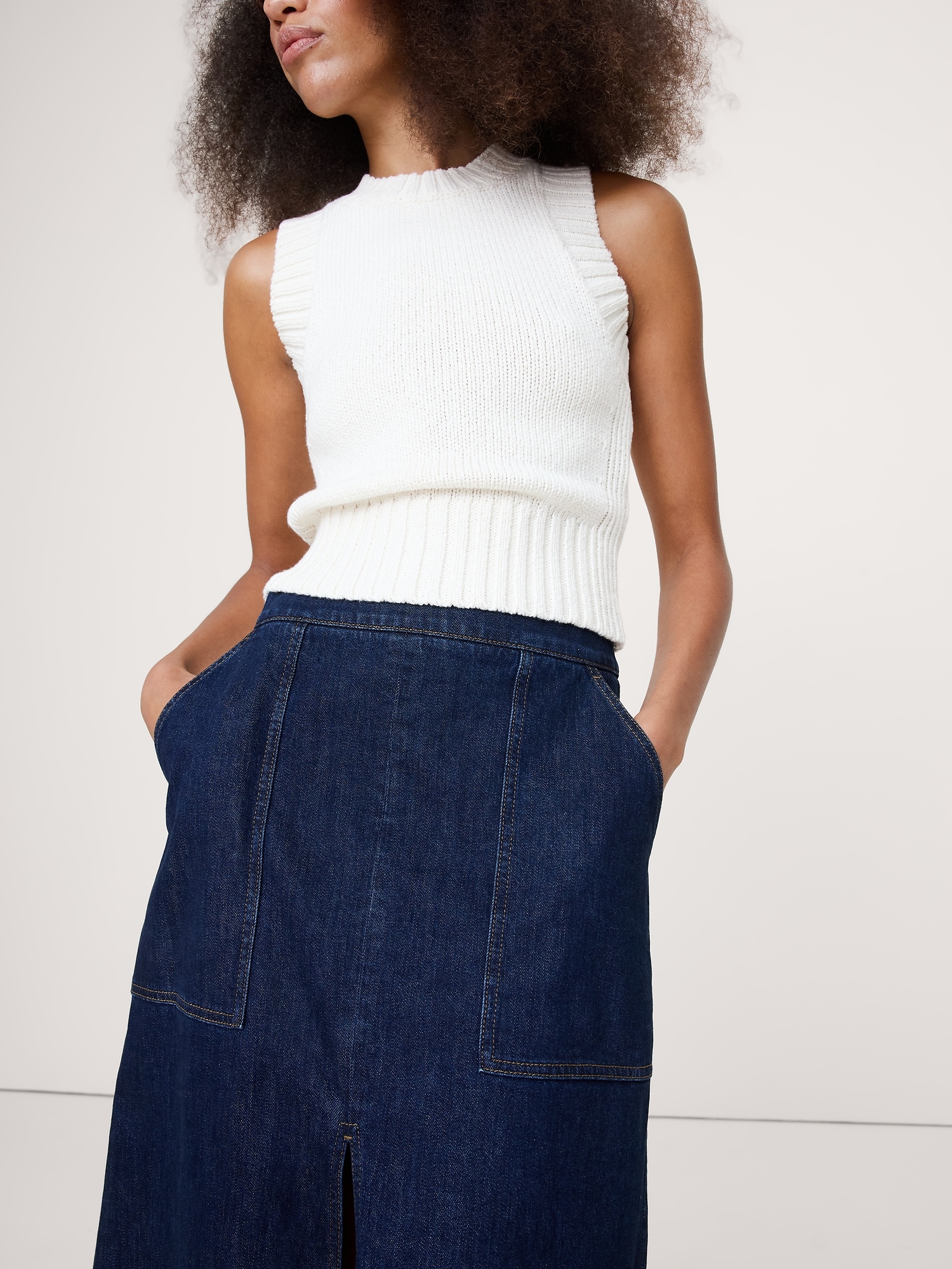 A sleek denim midi skirt. We cut this midi skirt in a soft, stretchy denim with patch pockets and slits at front and back for an at-ease look.