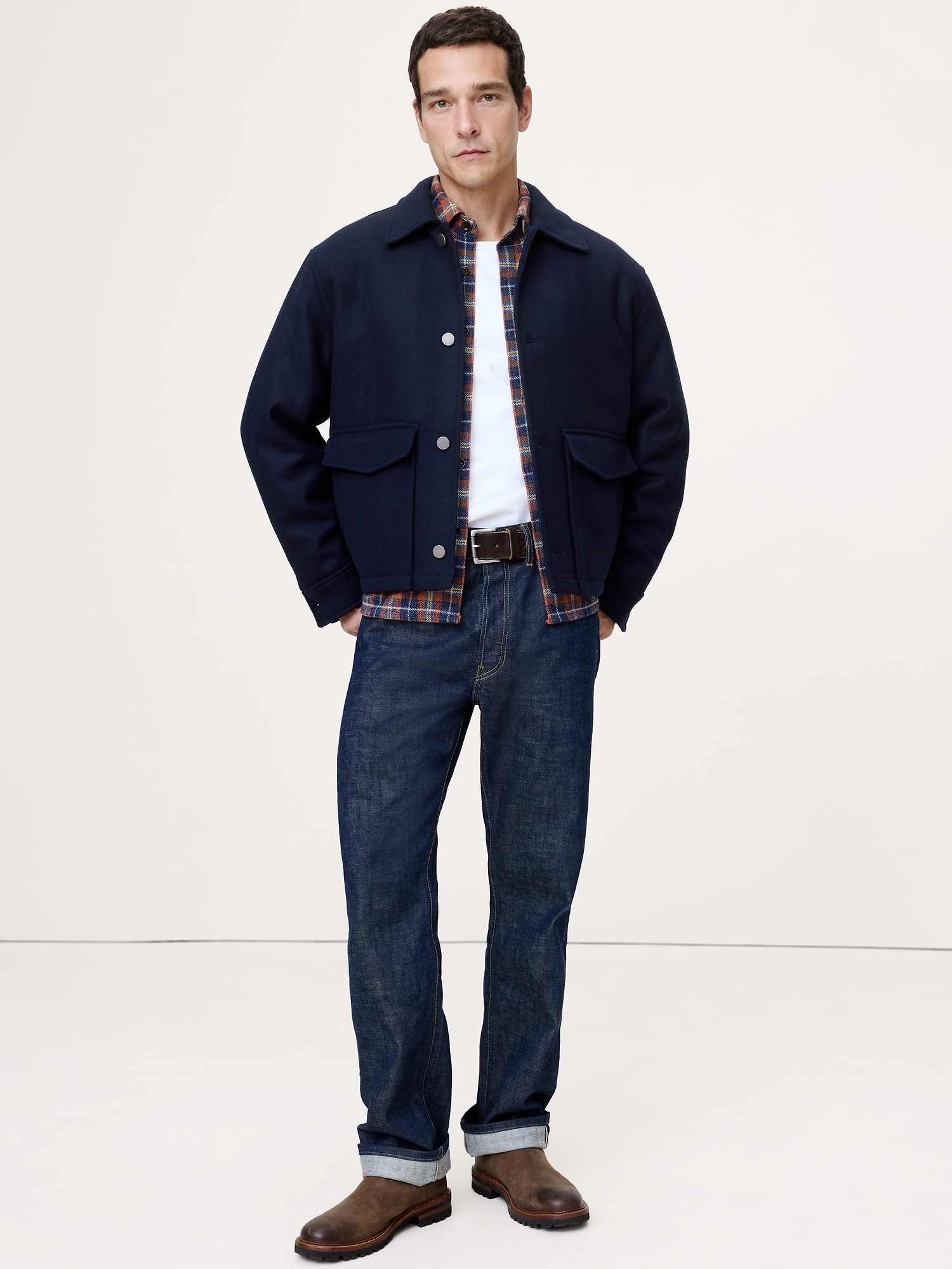 Like a streamlined take on the timeless trucker jacket, we cut this one in our signature double-faced wool blend and added a quilted lining with a little extra insulation to keep the elements at bay.
