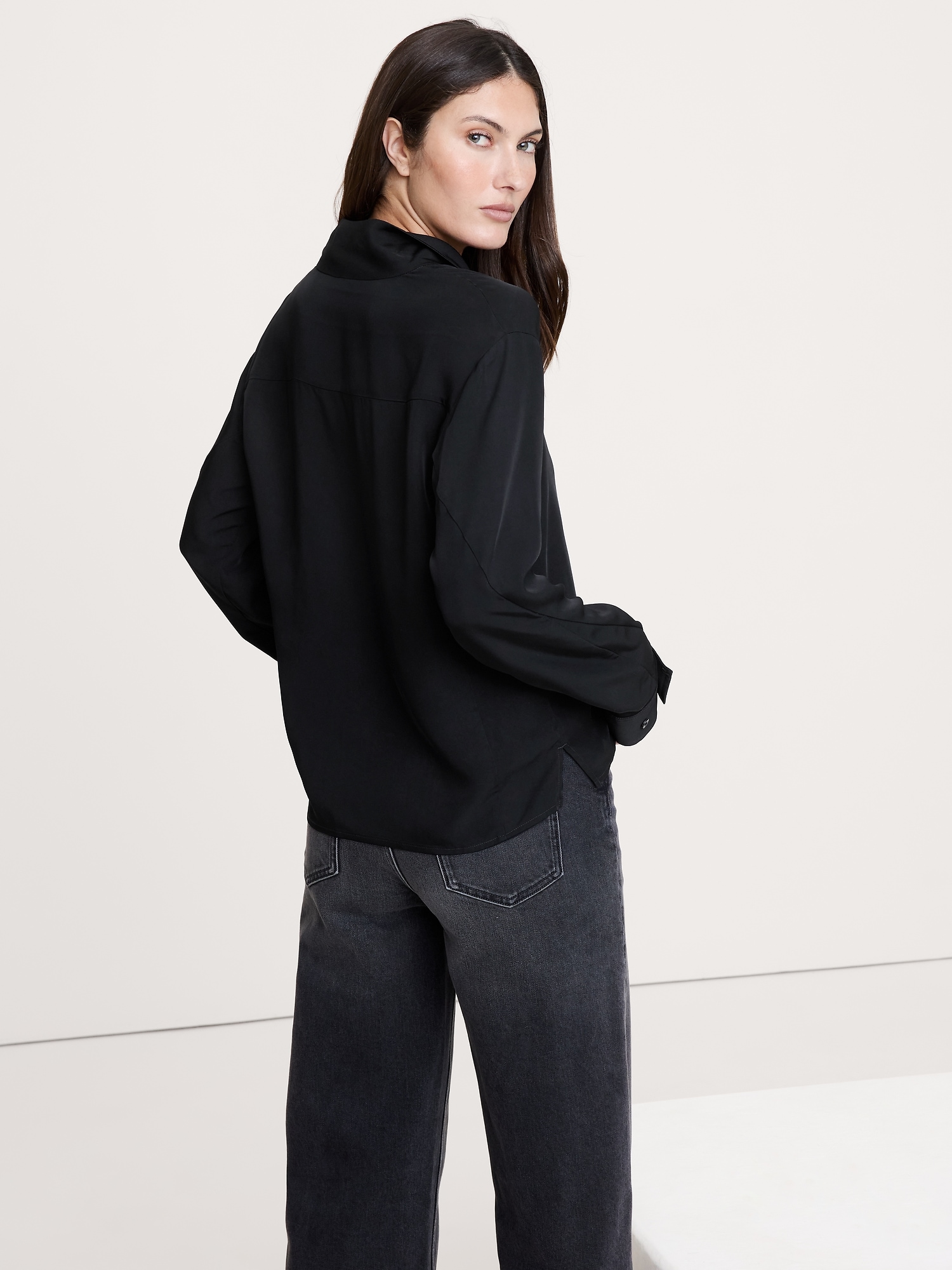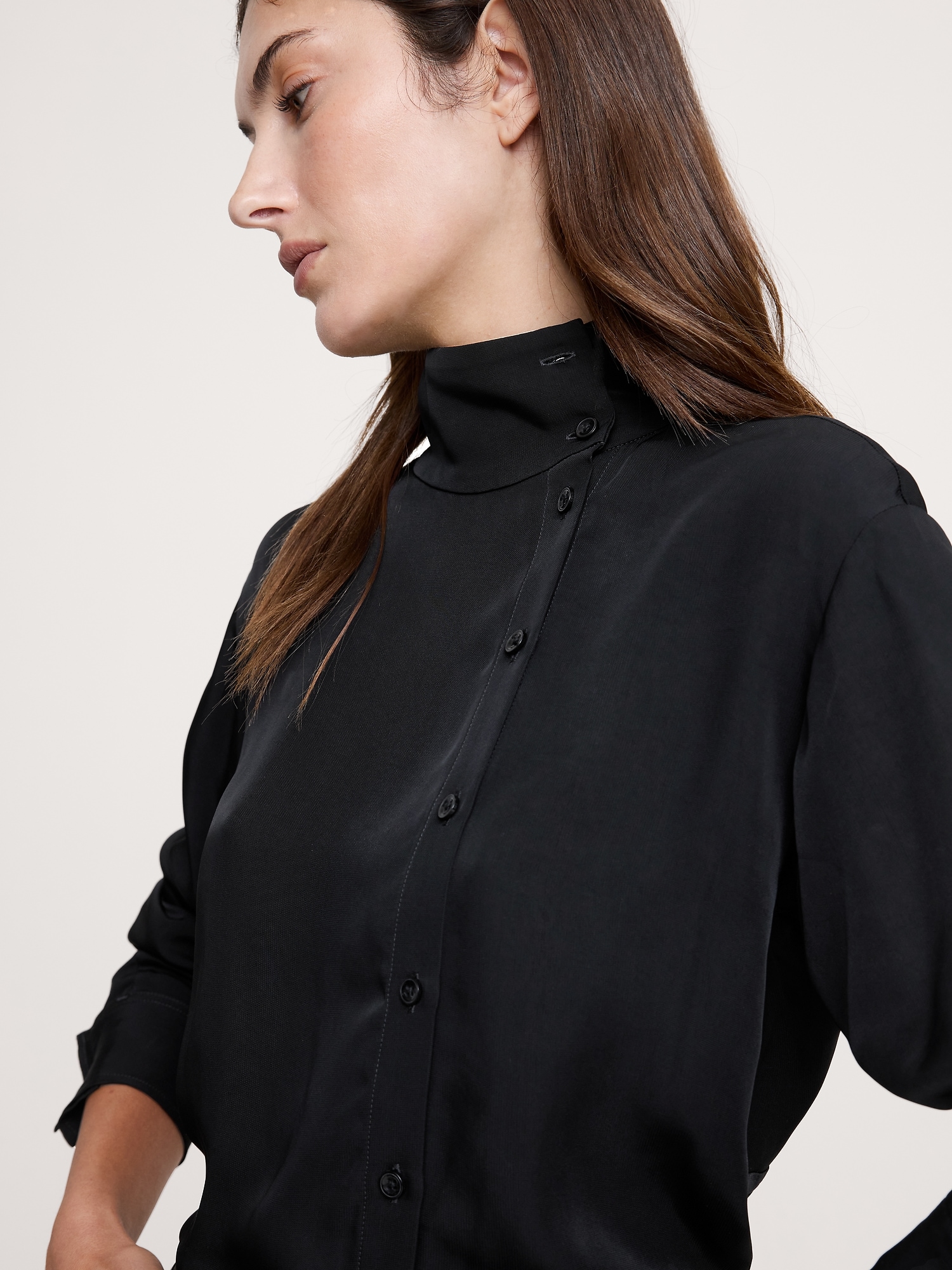 A classic button-down shirt with a twist. We offset the button placket and opted for a stand collar—leave it buttoned all the way up or unbutton a few for an asymmetrical neckline. Cut in our drapey twill so it’s a bit more dressed up.