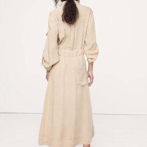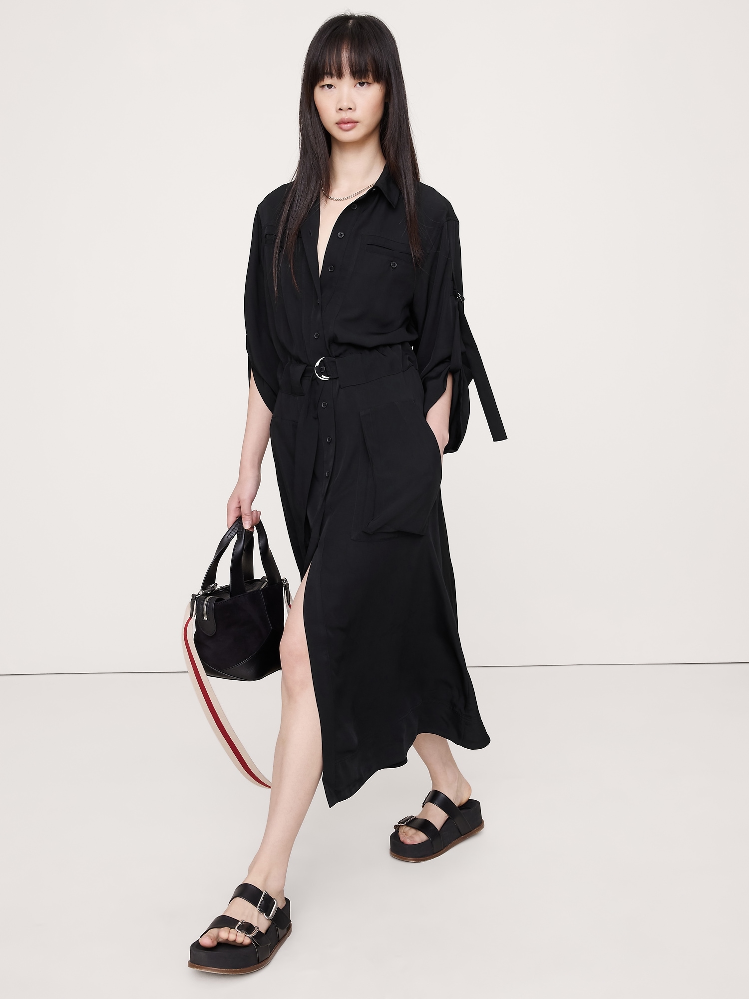 Always put-together, we love a shirt dress because you can wear it basically everywhere. Here, we imagined it with utility pockets in our drapey twill so it’s a bit more dressed up.