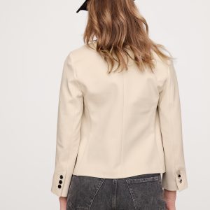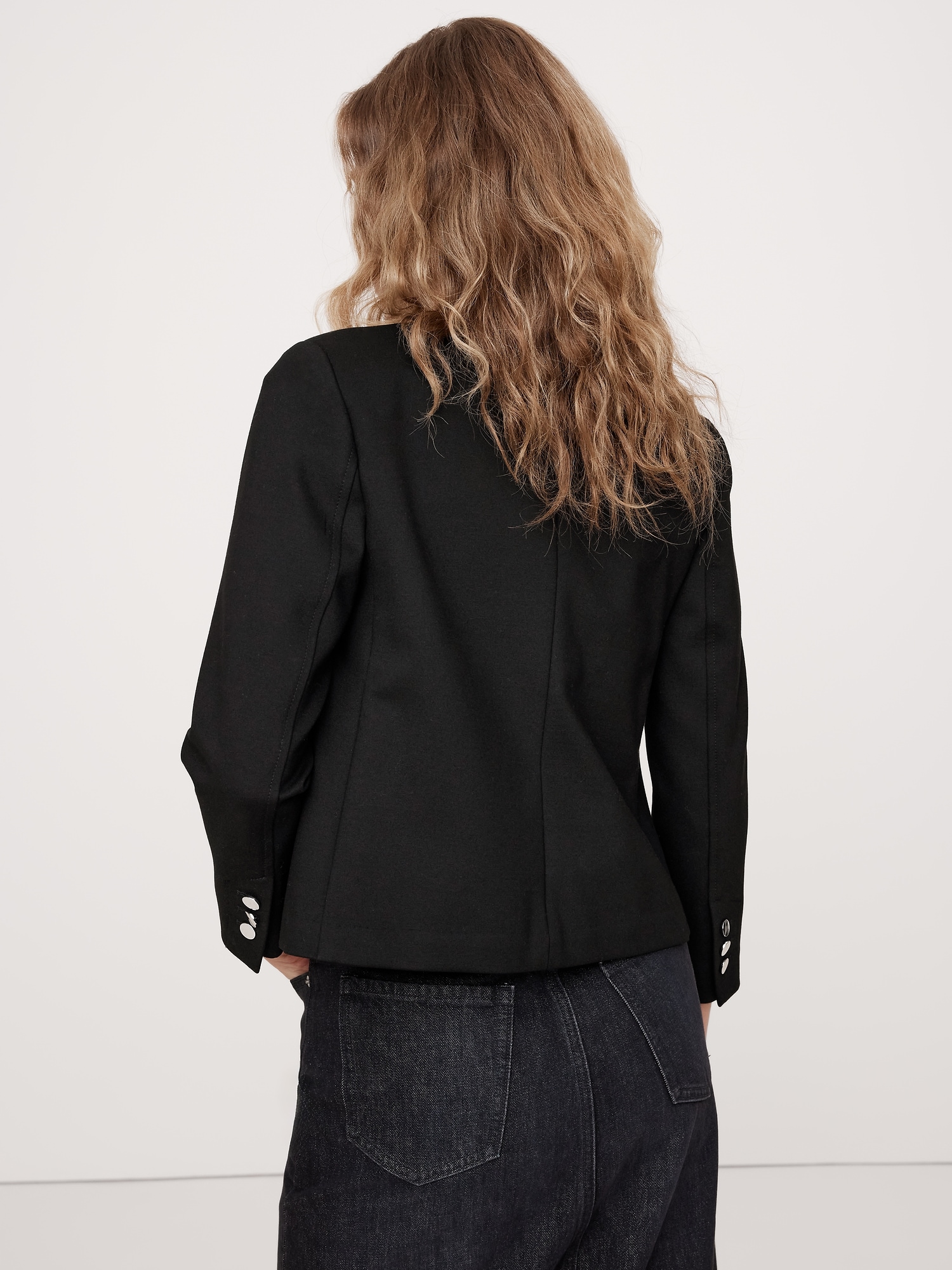 We cut this blazer in shrunken proportions using our Everywhere Ponte fabric—a favorite for its dressed-up look and high stretch for comfort. We added bracelet-length sleeves and small shoulder pads for a tailored silhouette, but opted for a butterfly lining at back.