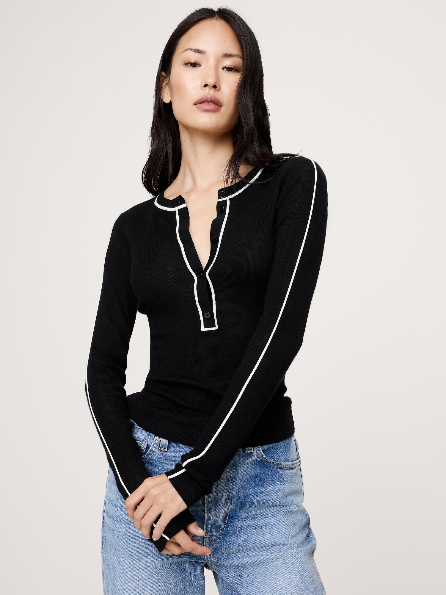 You have it all. This incredible cashmere henley uses a featherweight yarn that’s oh-so-soft—without sacrificing warmth—and just a little heavier than a t-shirt in weight.Slim. Sits close to the body.
