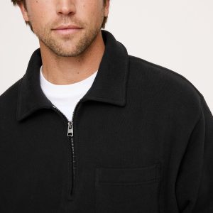 Team Cozy. We reached for one of our softest sweatshirt fleeces here, opting for a boxy, relaxed fit and zip-placket polo collar for a vintage vibe.