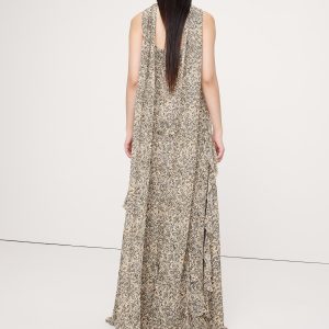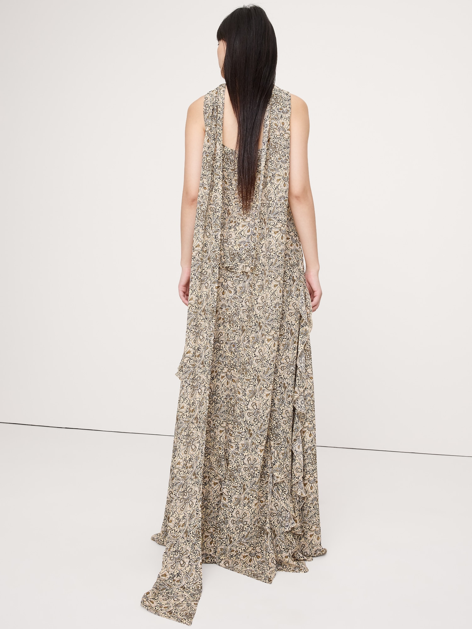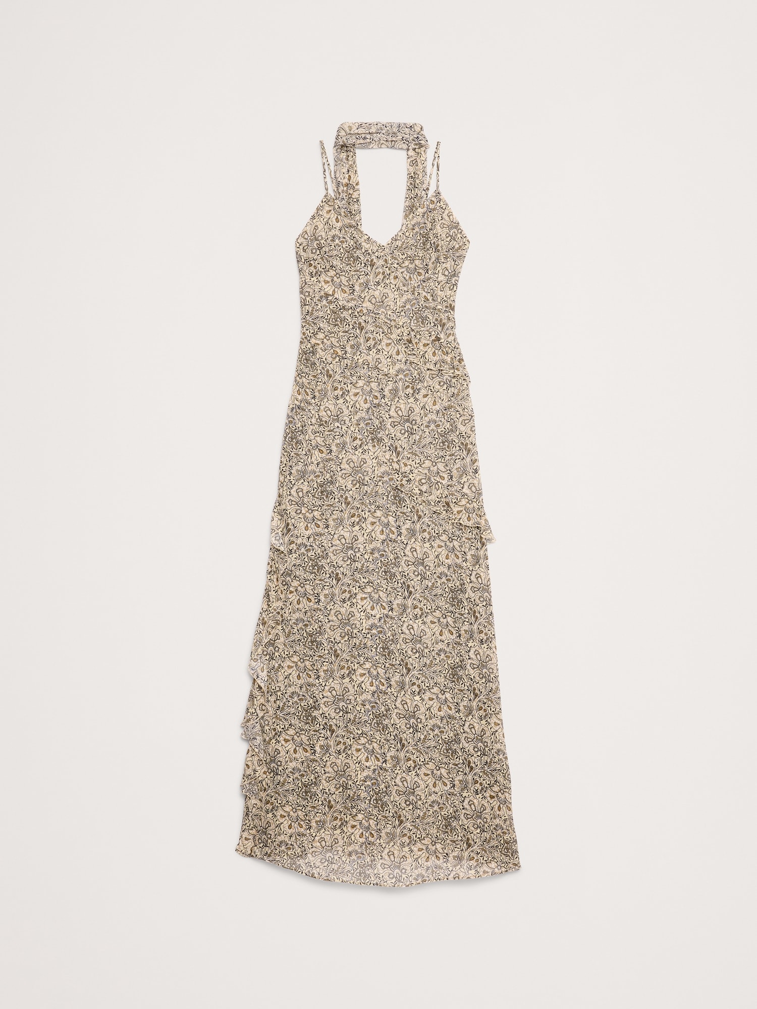 Going somewhere? Wear this. We cut this ruffled maxi dress from a soft, light-as-chiffon georgette, opting for a wraparound construction technique to show off your shape. Plus, it comes with a long, skinny scarf to toss across your shoulders, wrap around your neck, or tie in your hair.