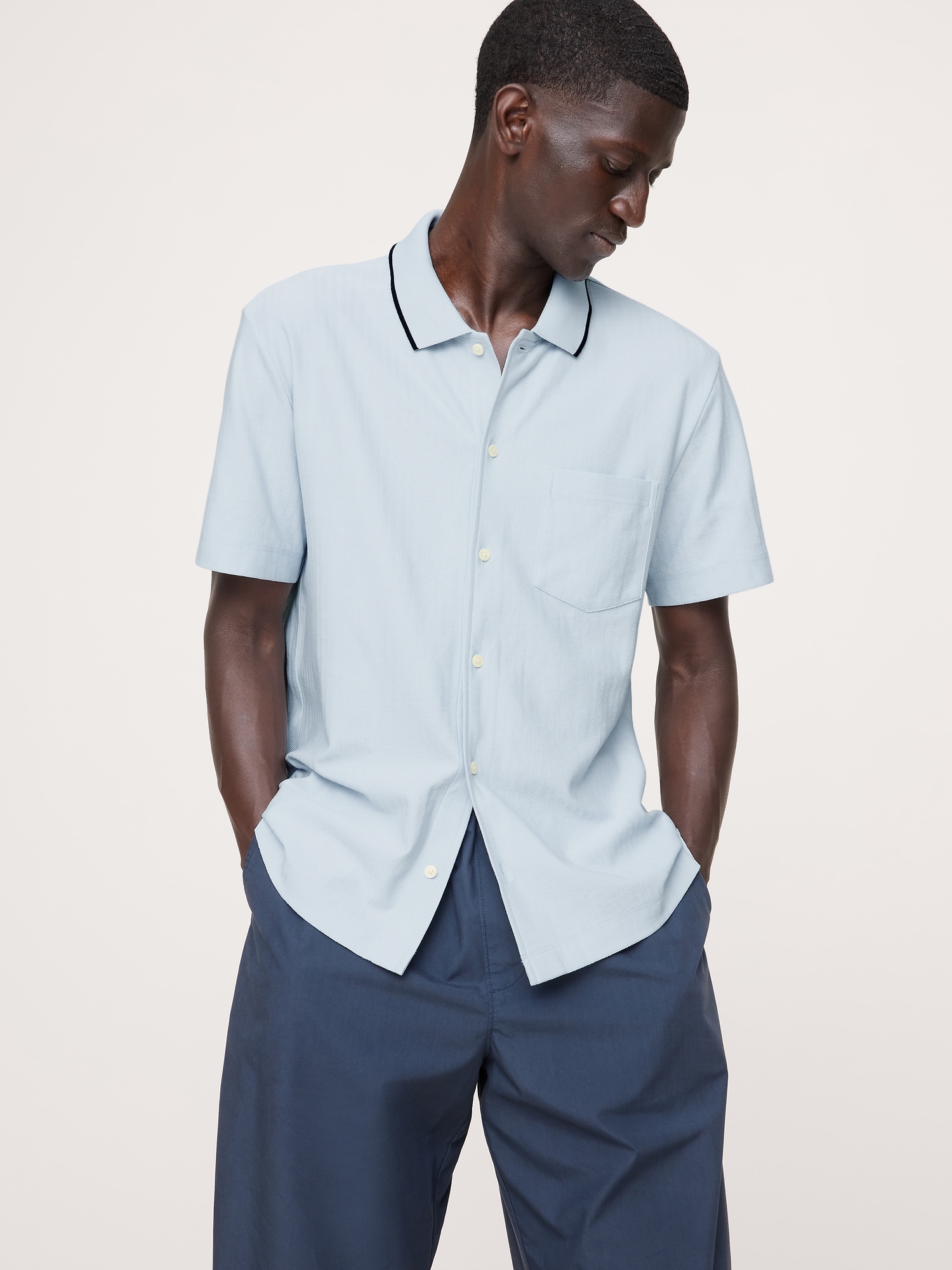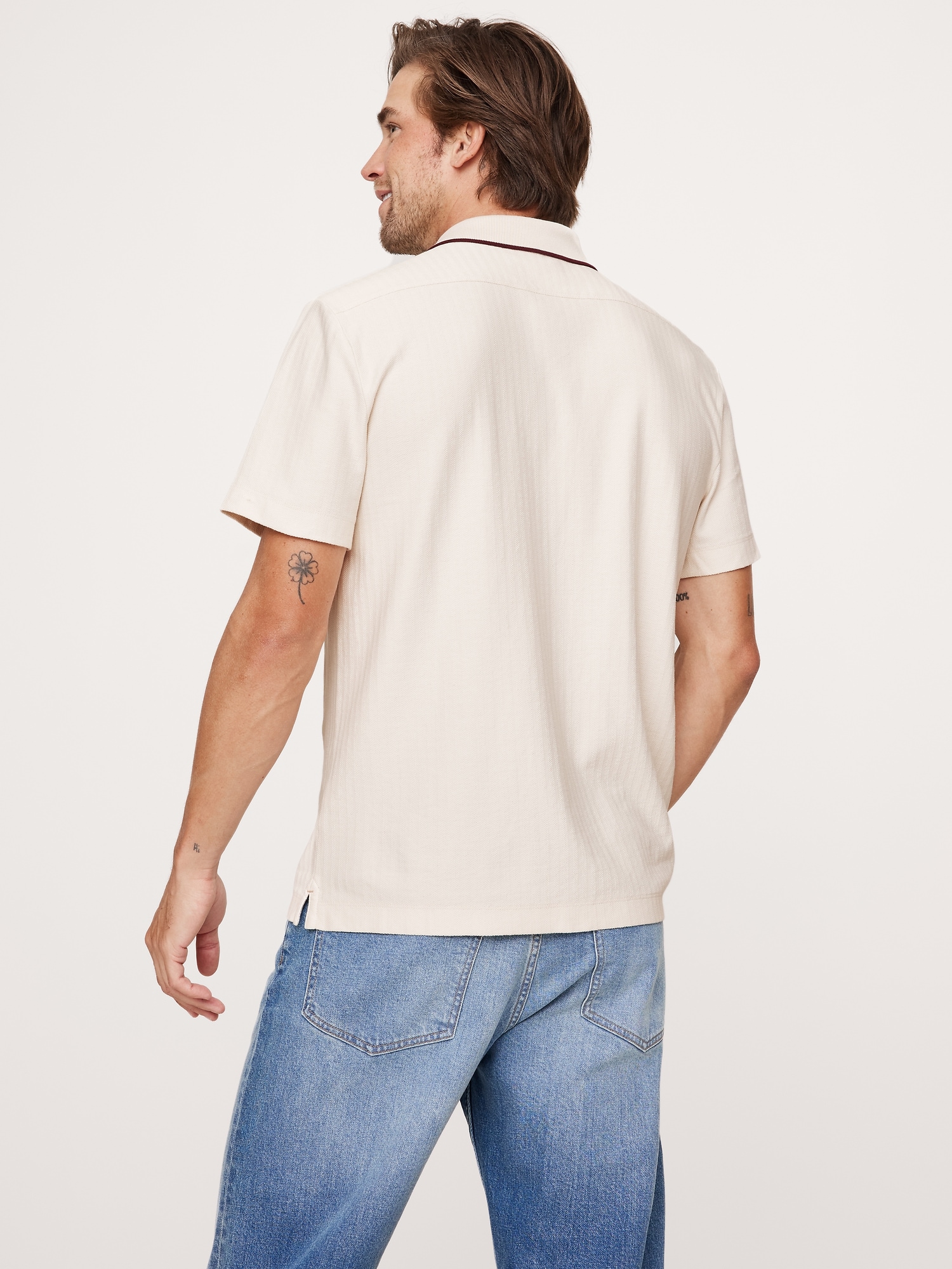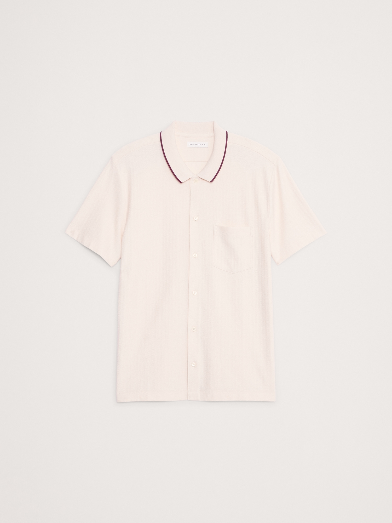 We love the herringbone texture of this soft, resort shirt. Plus, we added a contrast color accent at the collar for a vintage vibe.