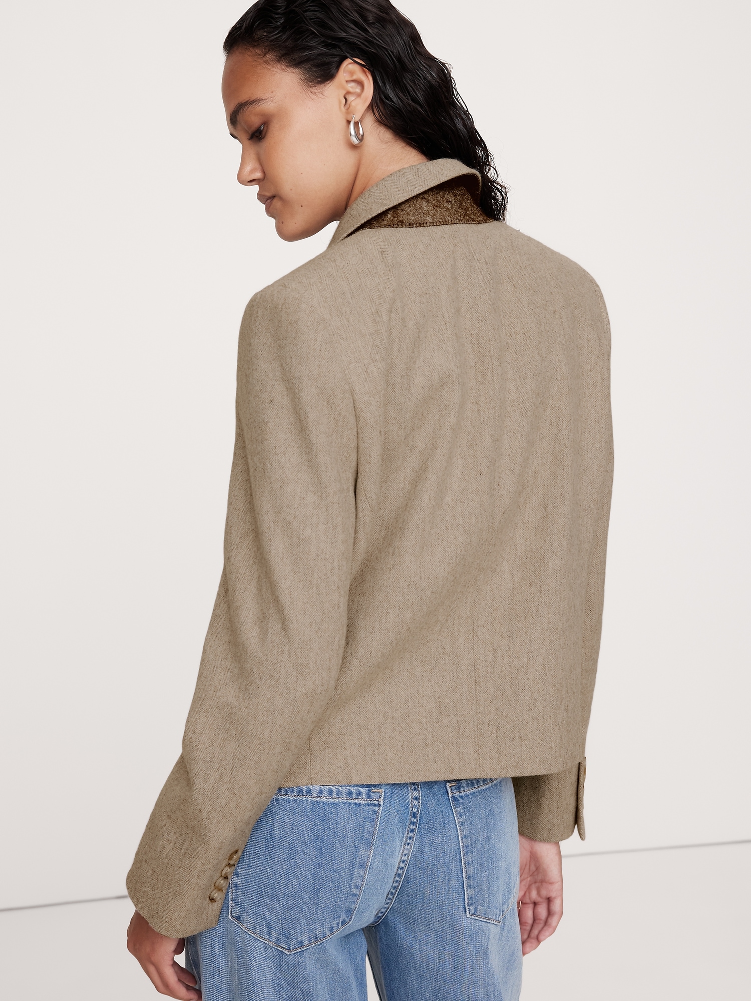 This double-breasted blazer is cut for a boxy, cropped fit with sharp shoulders. For fabric, we reached for a beautiful wool flannel fabric we love for its herringbone weave and its ability to carry you through cooler seasons.