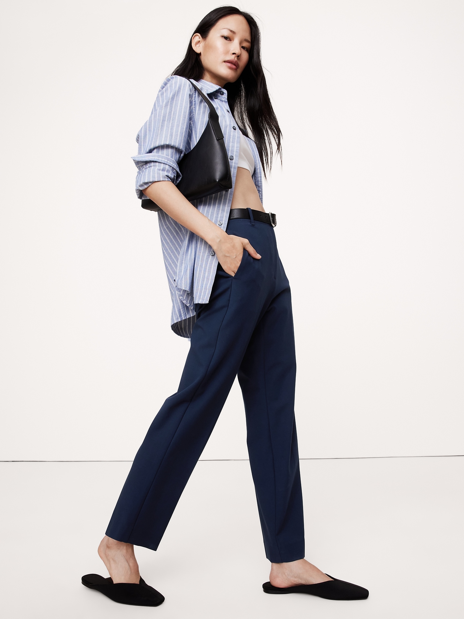 We love when a pant that looks as good as it feels, so we cut this high-rise slim pant in our best-selling Refined Bi-Stretch—a favorite for its stretchy feel and soft structure. Look closely: our designers chose a Hollywood waistband and darts at the back waist to create a high-rise with clean lines.