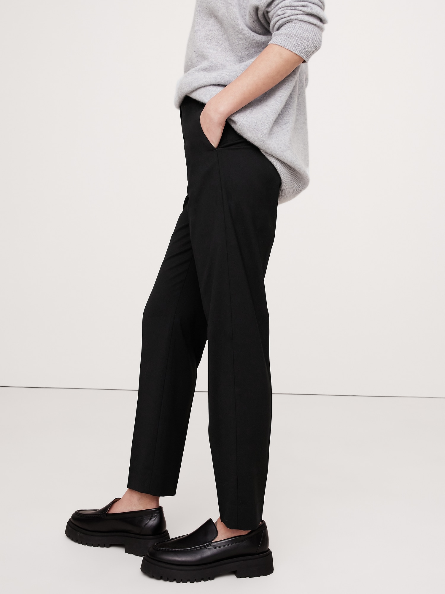 We fell hard for our signature Siena lightweight wool for its all-season weight, subtle stretch, and Italian origins. Here, we cut a slim silhouette with a high-rise and added a trouser crease so it’s giving full-on business formal. Wrinkle-Resistantrise (11.5\”). Fitted waist and hip, semi-fitted through the thigh with a slim leg. Ankle length.