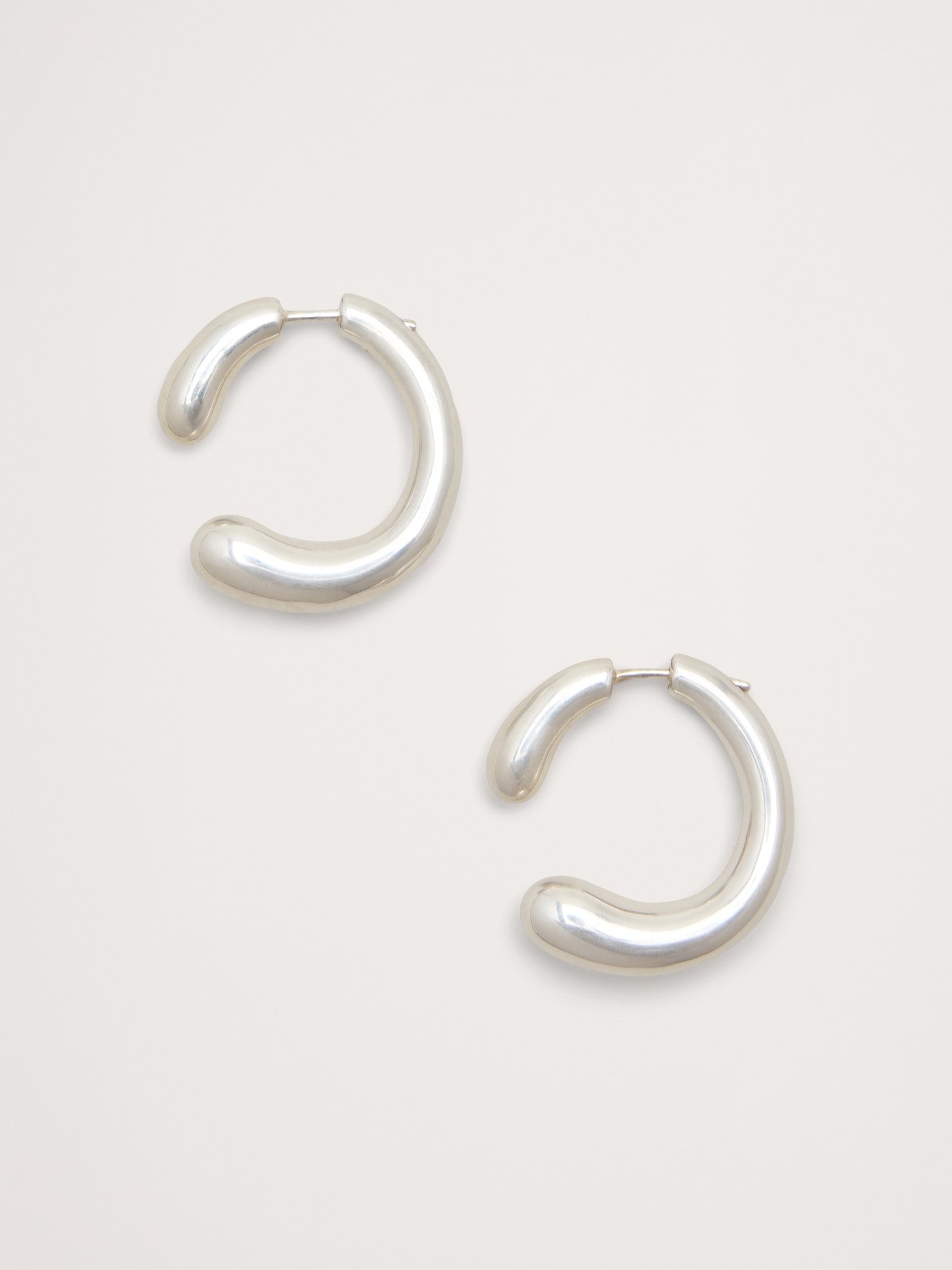 Classic hoop earrings reimagined in a an organic shape so they can be worn facing forward or back. Finished in either 14k-gold or 999-silver plated brass.