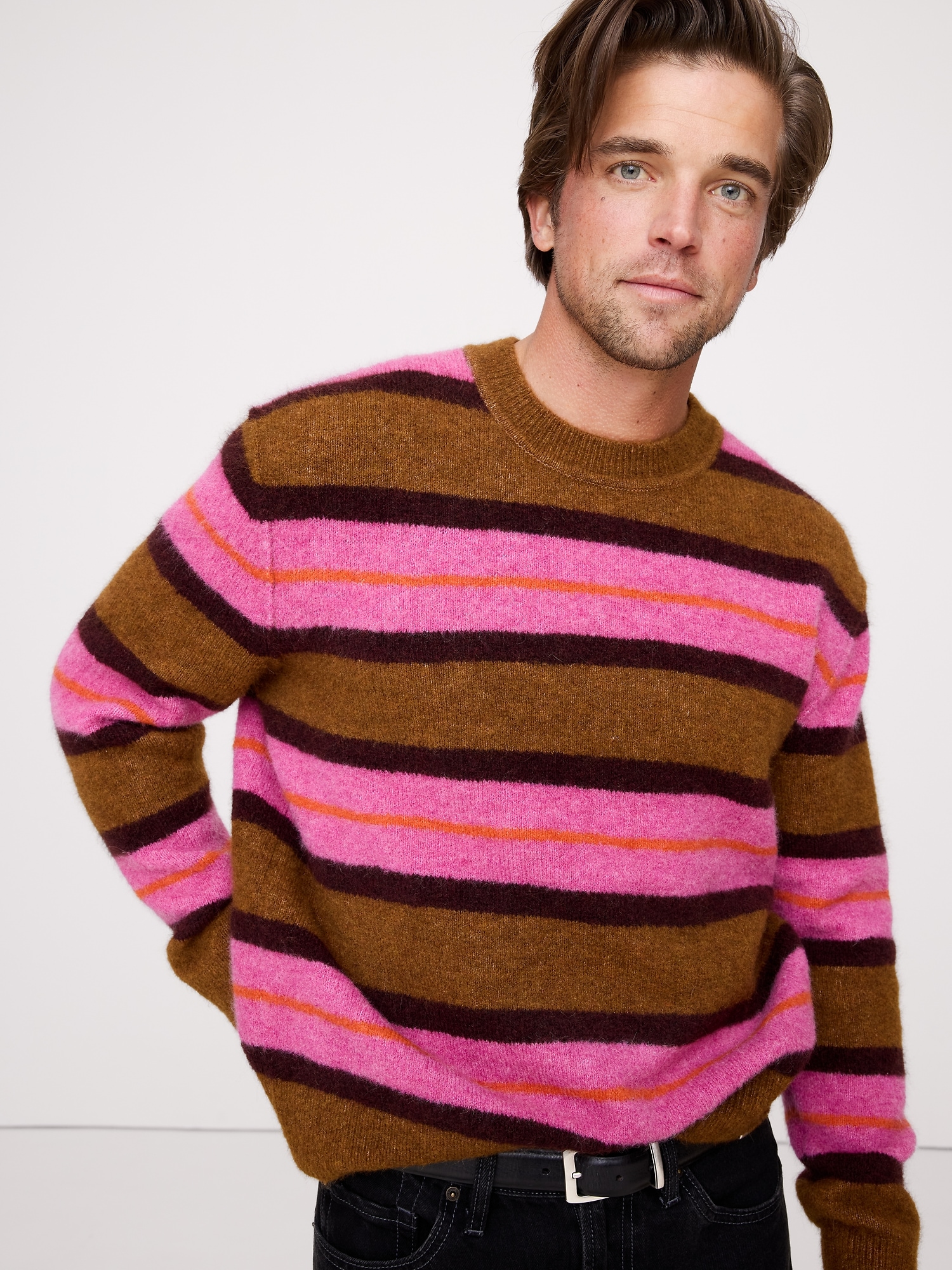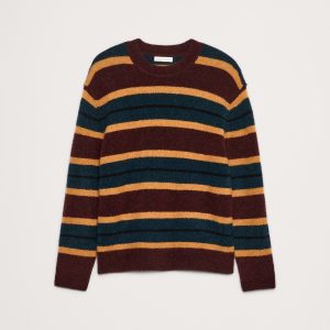 We love the cozy, brushed finish of this extra-warm alpaca and wool blend so we put it to use in a classic crew-neck silhouette with stripes that show off its rich colors.
