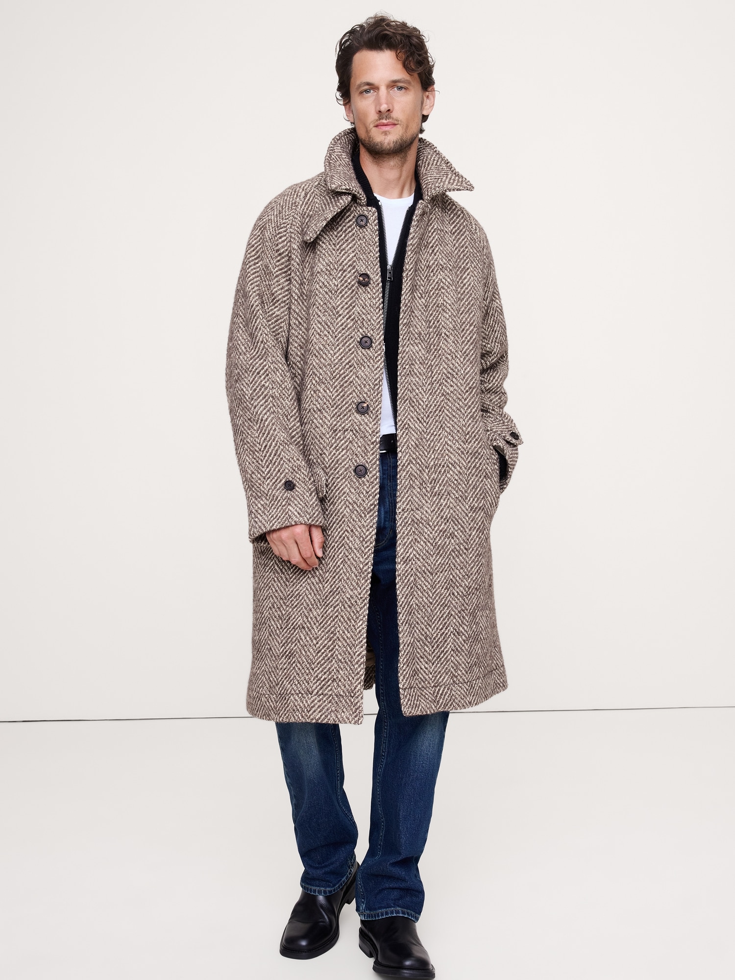 Modeled after the traditional Balmacaan coat, this piece is cut from an Italian, wool-blend fabric woven in a herringbone pattern with a beautiful tweed-like finish.