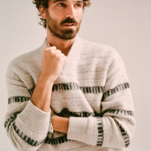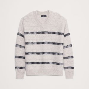 A v-neck sweater with a vintage vibe. Look closely: this one achieves its subtle, tonal stripe by mixing both colors and stitch types, in a soft and warm blend of alpaca, wool, and nylon.