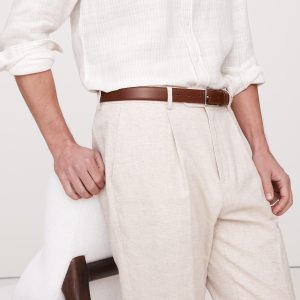 This versatile belt is cut from beautiful, sturdy leather and finished with beveled edges for a sleek look that works well dressed up or down.
