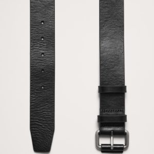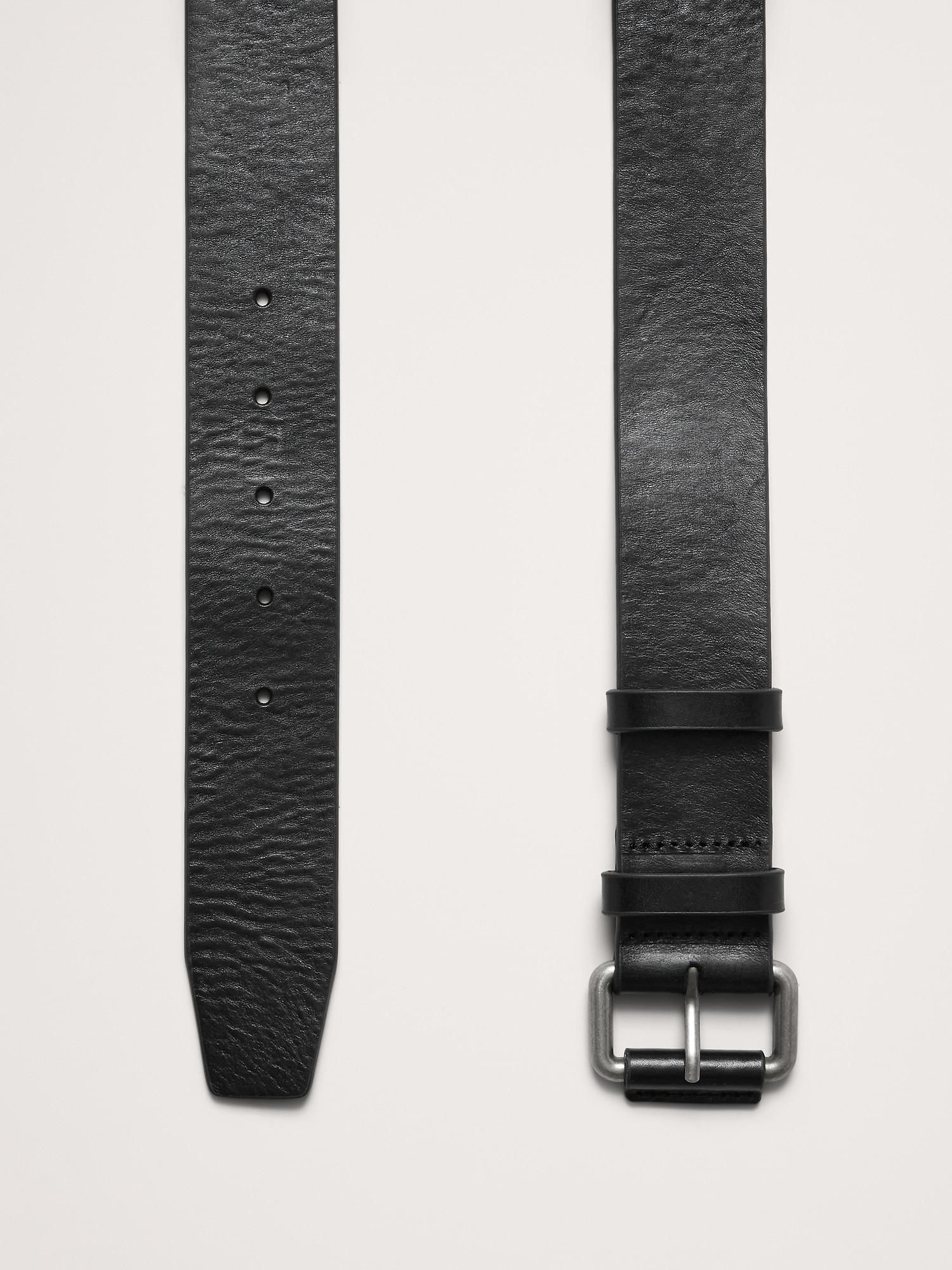 A sturdy and rugged leather belt, with a leather-covered roller buckle accent.