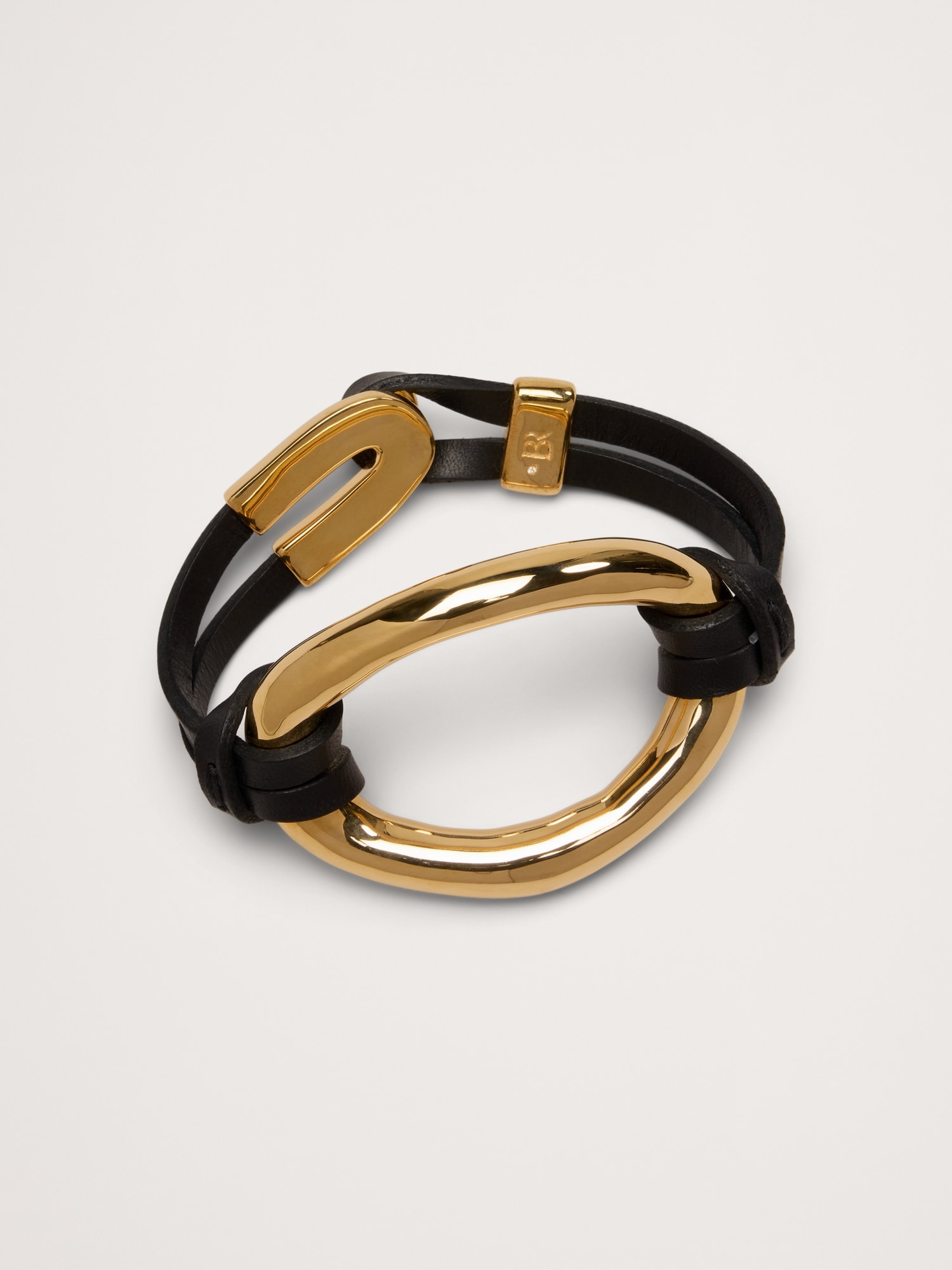 A bold exploration of contrasting textures, this bracelet juxtaposes a fluid oval against luxurious leather. Here, artisans handcraft each piece from either 14k-gold or 999-silver plated brass.