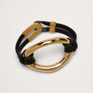 A bold exploration of contrasting textures, this bracelet juxtaposes a fluid oval against luxurious leather. Here, artisans handcraft each piece from either 14k-gold or 999-silver plated brass.