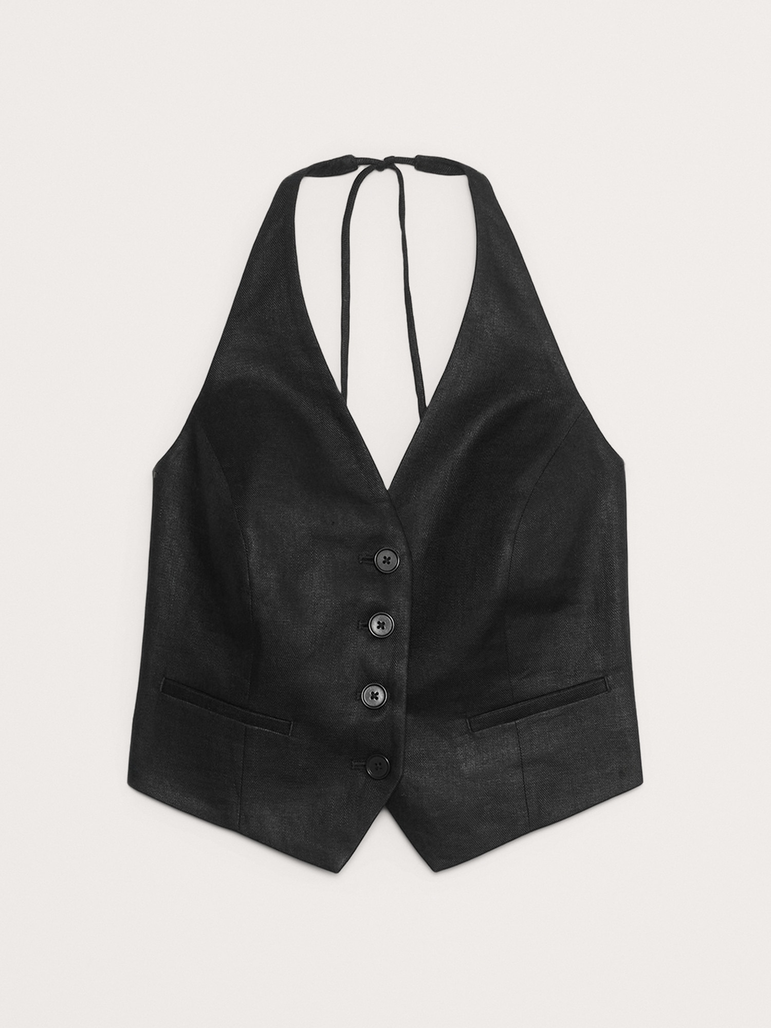 Made from luxurious linen, we cut this vest with a halter neck that ties at back. Style with linen pants and flat sandals, or dress it up with a linen midi skirt and statement jewelry.