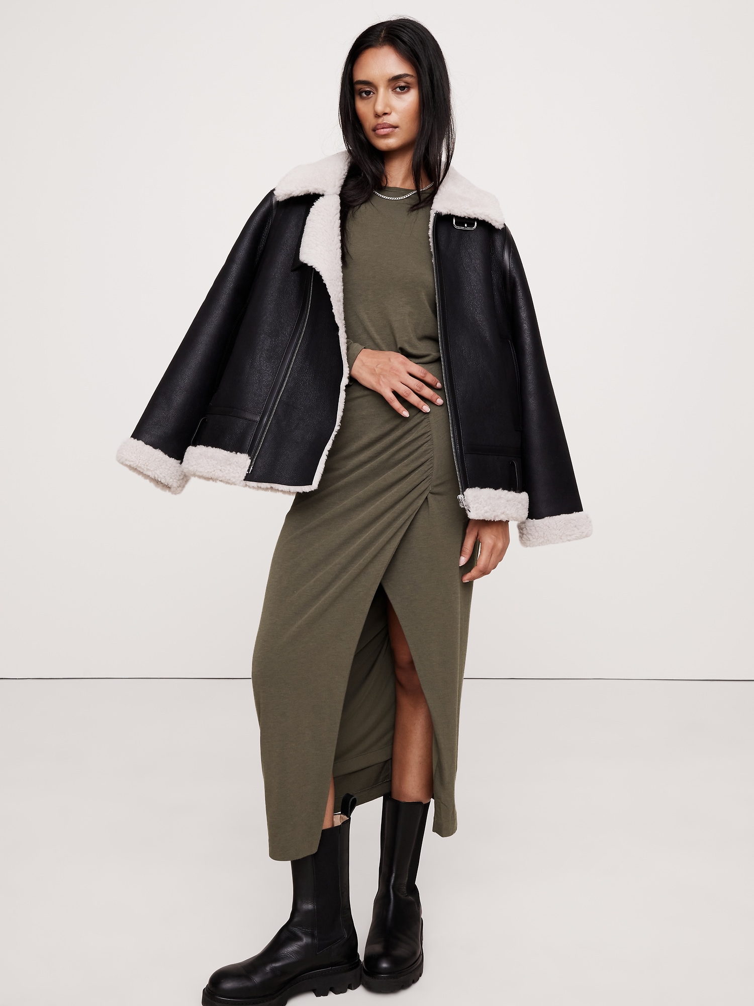 We cut this midi skirt from our best-selling Luxe Wool-Blend—a luxurious jersey in a weight that’s suitable for layering through cooler weather. Here, we added a draped detail at the side to create rich ripples and folds that accentuate the soft drape of this customer-favorite fabric.