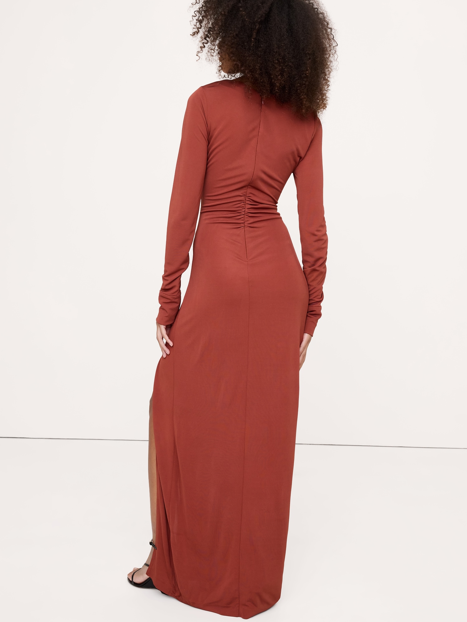 Quite the gathering. This figure-hugging maxi dress is cut from our best-selling matte jersey knit (so it’s t-shirt soft and looks fab), here with ruching at the sides and a slash neckline.