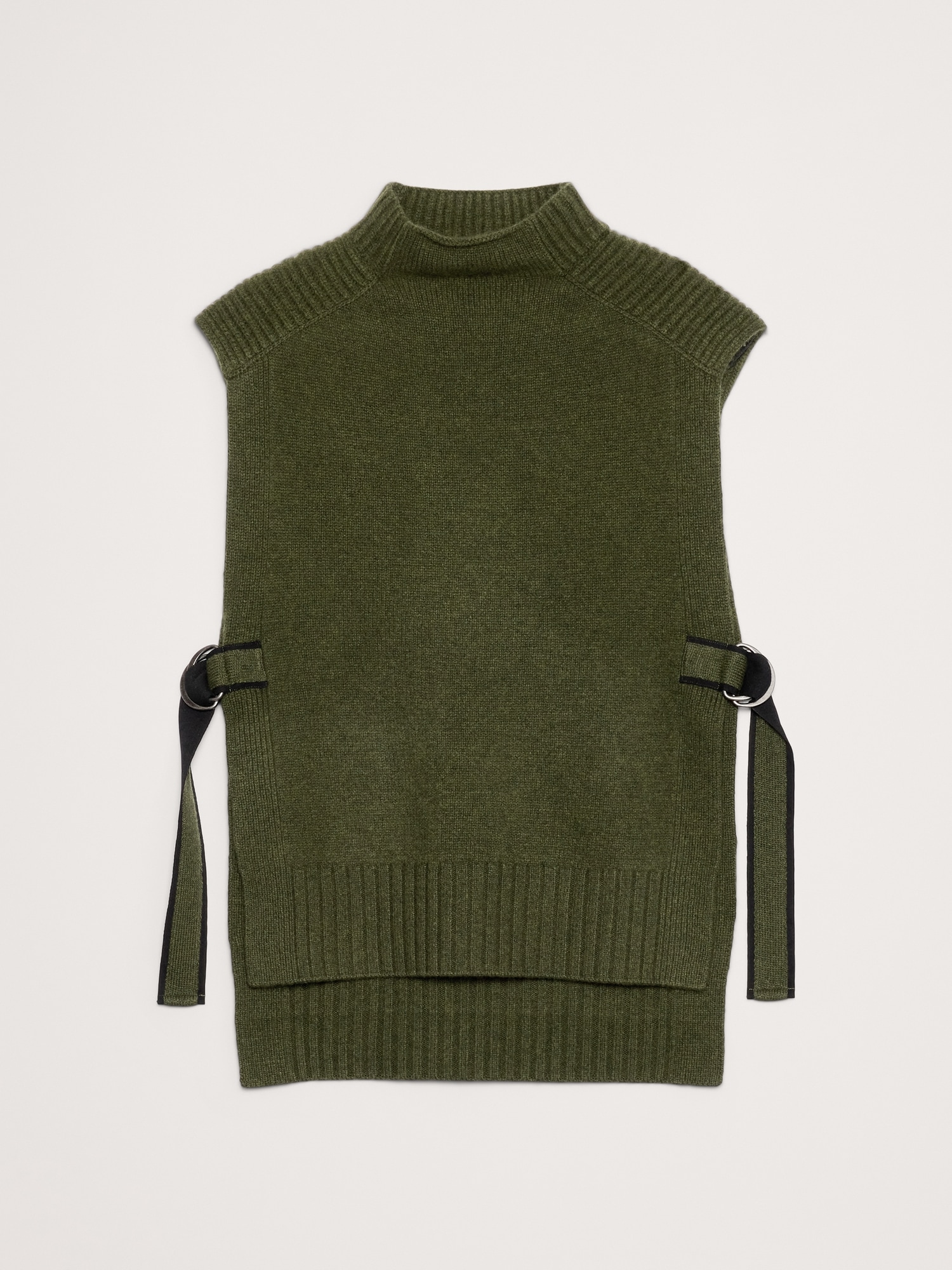 A layer to carry you through cooler seasons to come, we designed this cute sweater vest with open sides as an invitation to play with proportions Crafted in a warm and luxuriously soft blend of Merino wool and cashmere.