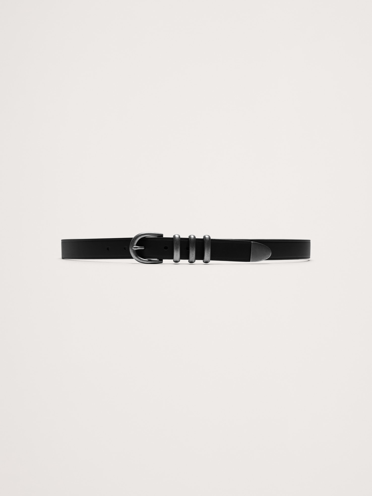 A subtle statement, this leather belt has a row of three metal keeper tabs for a modern look.