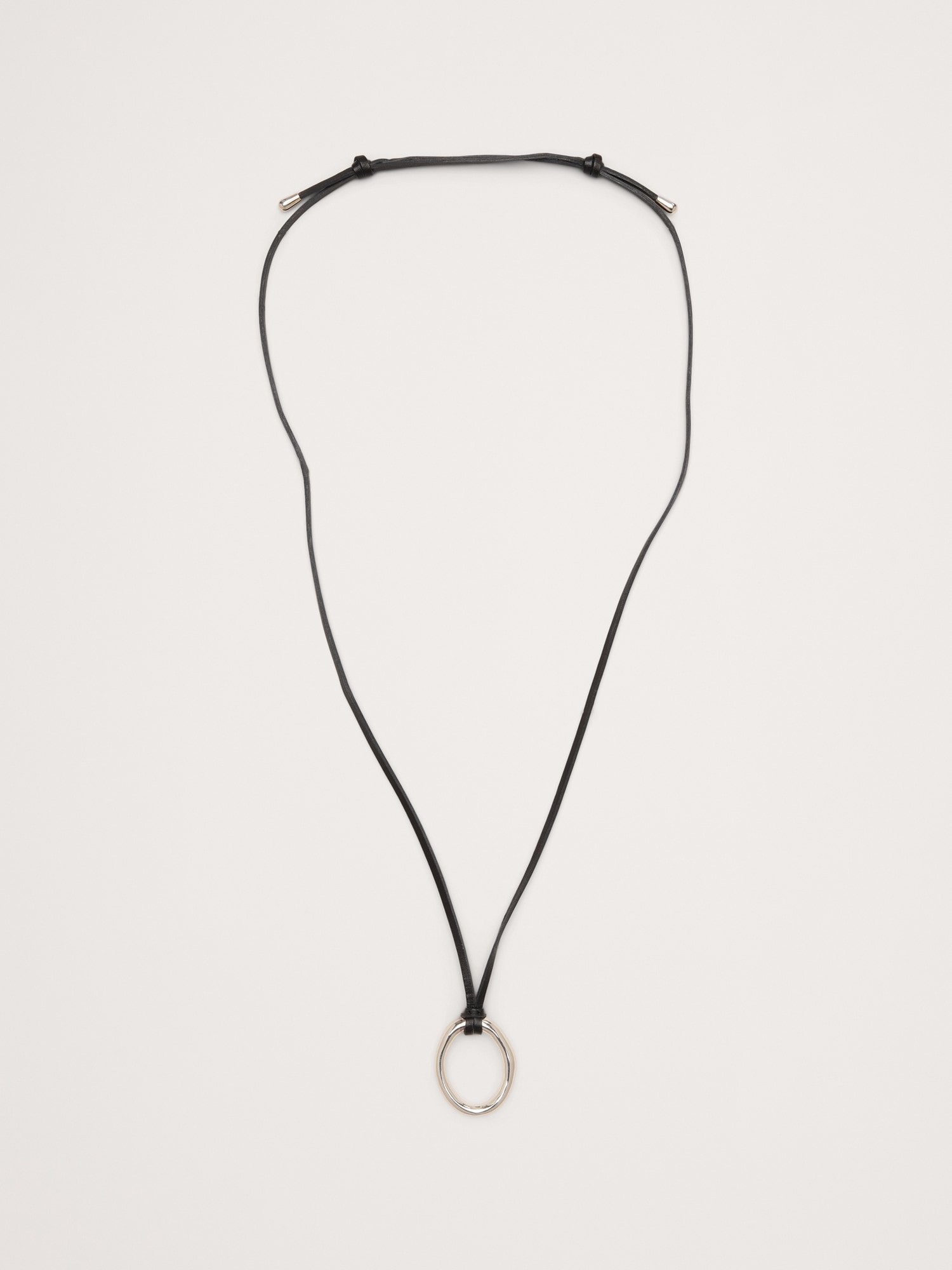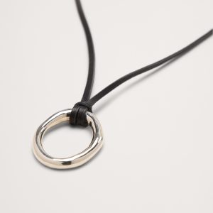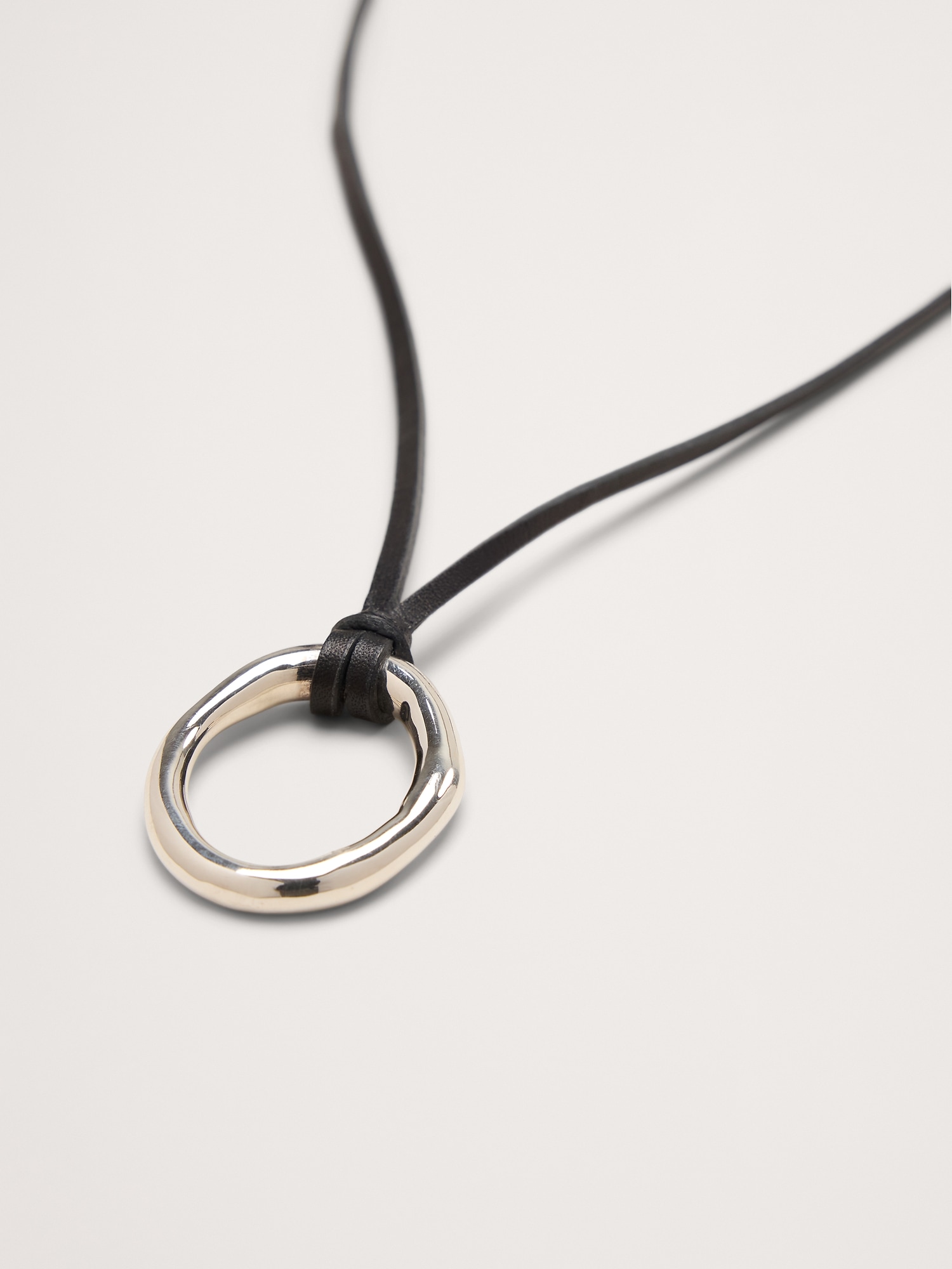 A coiled silver ring suspended from a simple, leather cord, finished in 999-silver plated brass.