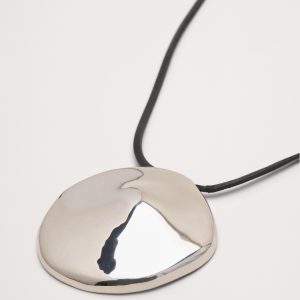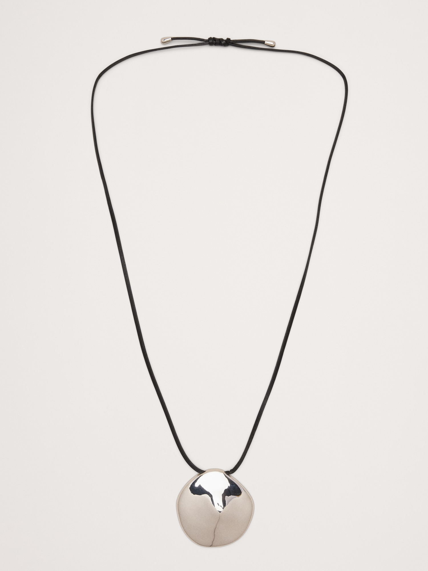 Hand hammered medallion suspended from a simple, leather cord, finished in 999-silver plated brass.