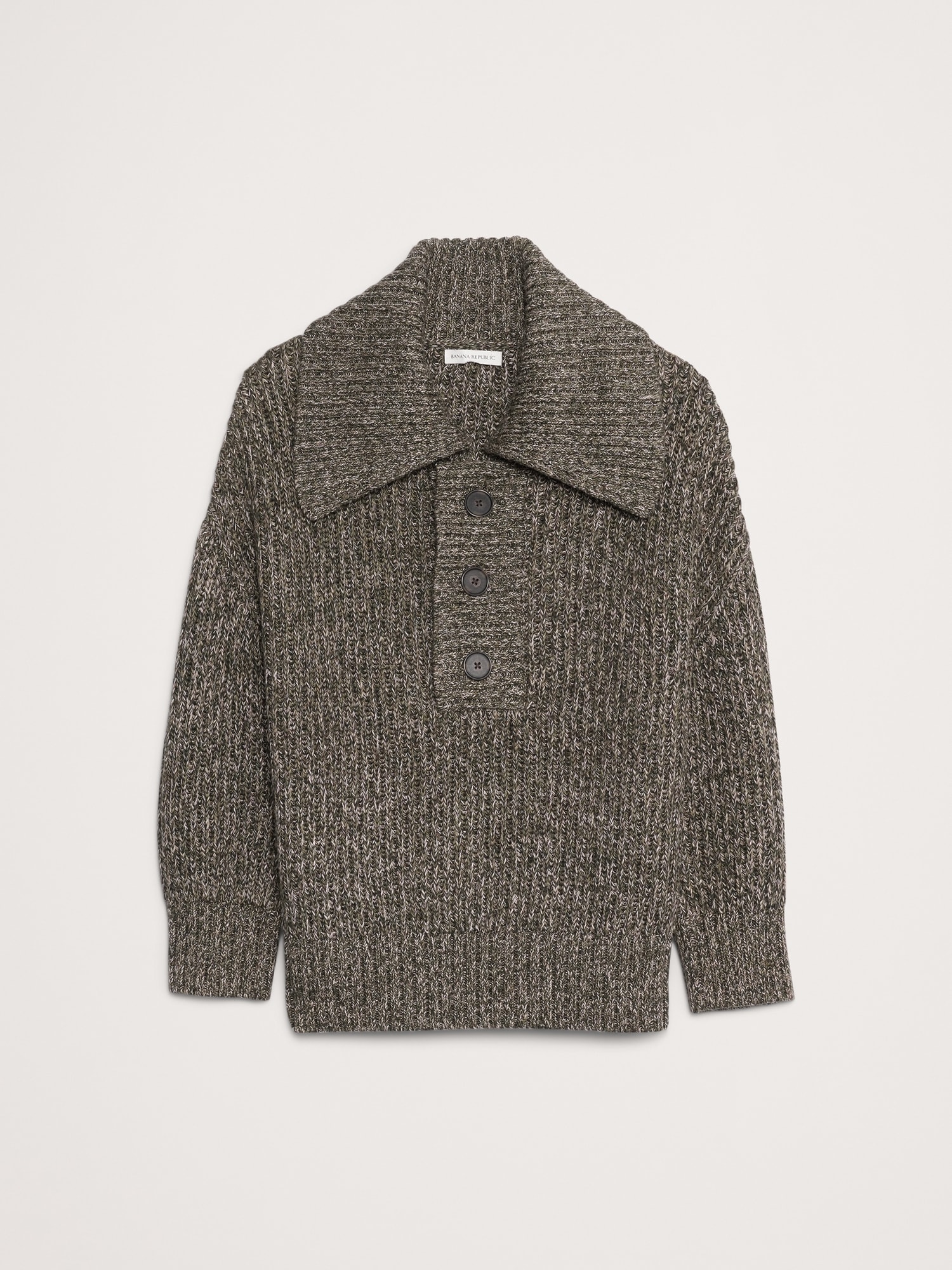 Everything about this sweater is the oversized fit, jumbo buttons, a dramatic sailor collar, and a beautiful, richly marled yarn spun from organic cotton.