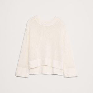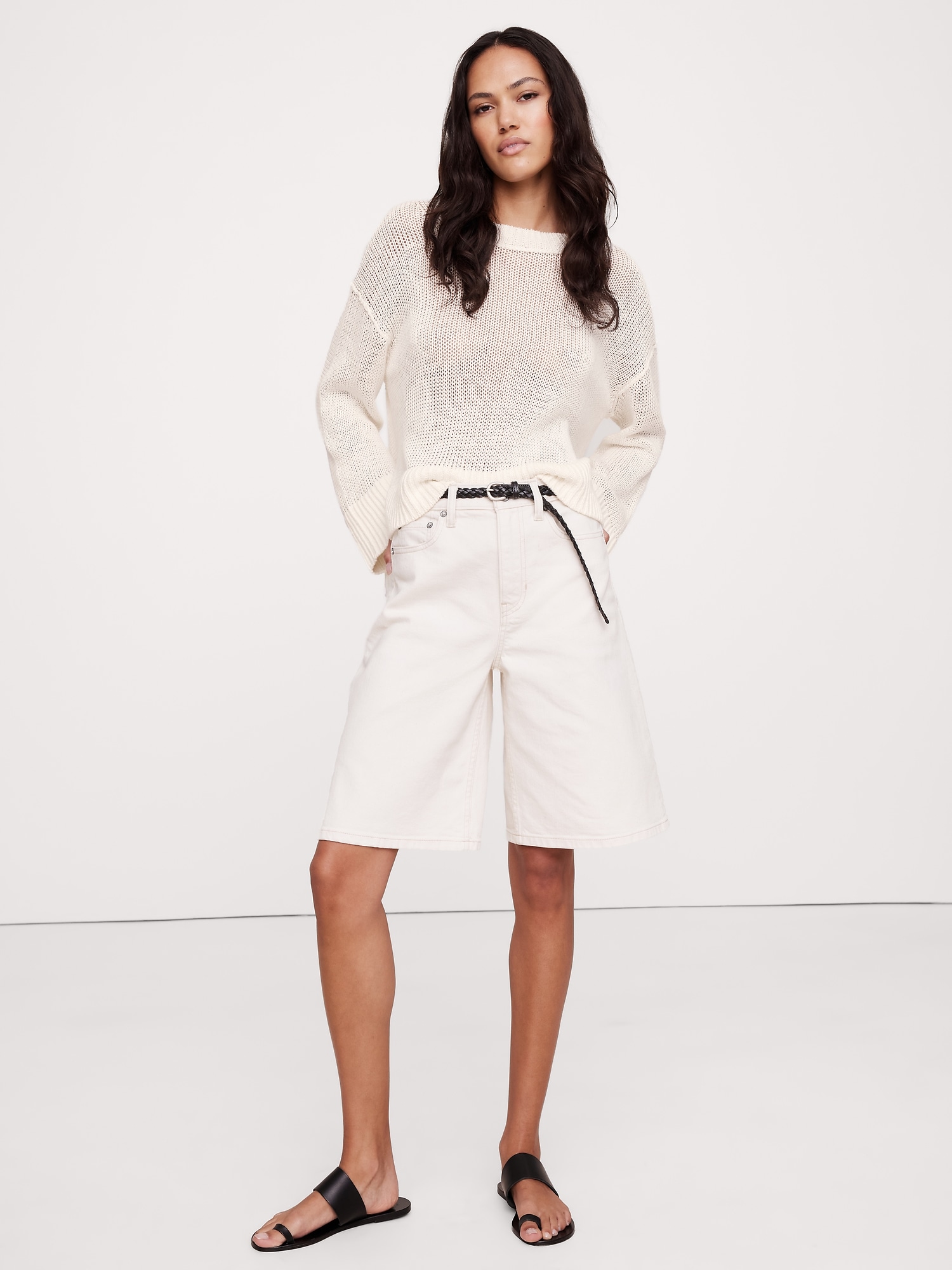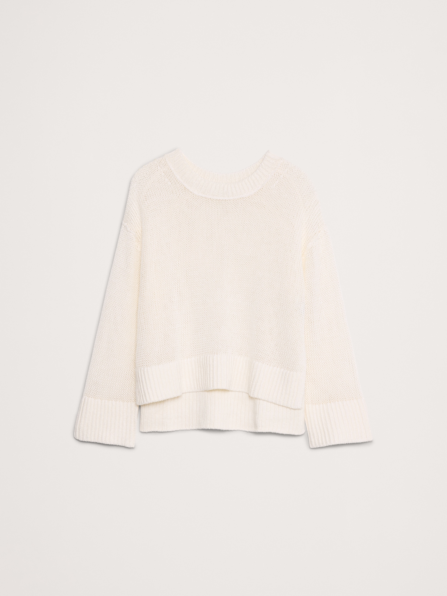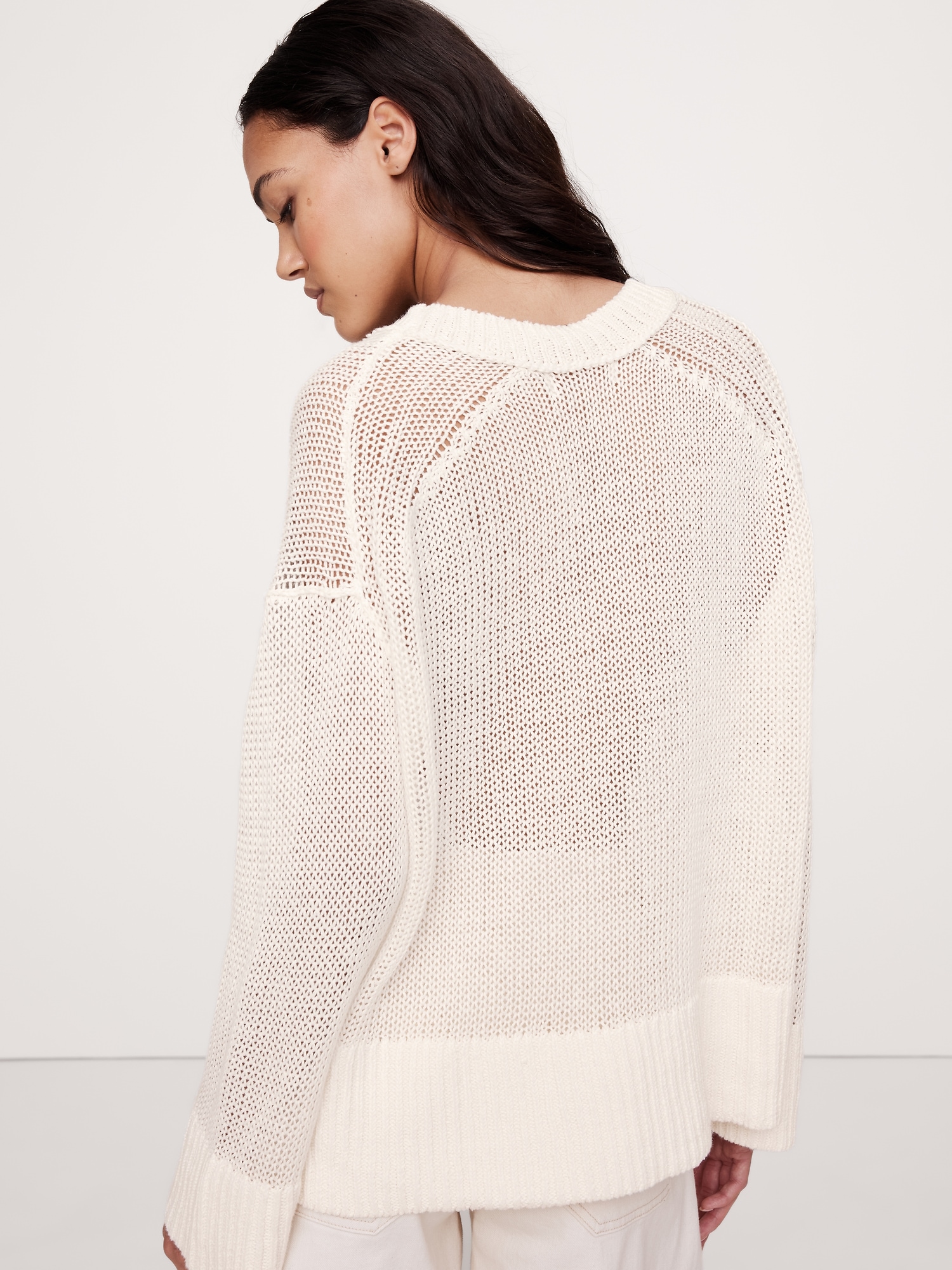 This summer we’re living in 100% linen. Enter, this long-sleeve sweater. It has a slouchy fit and textured seams. Plus, we knit it in our signature, chunky linen yarn using a stitch that gives it beautiful drape and semi-sheer look.