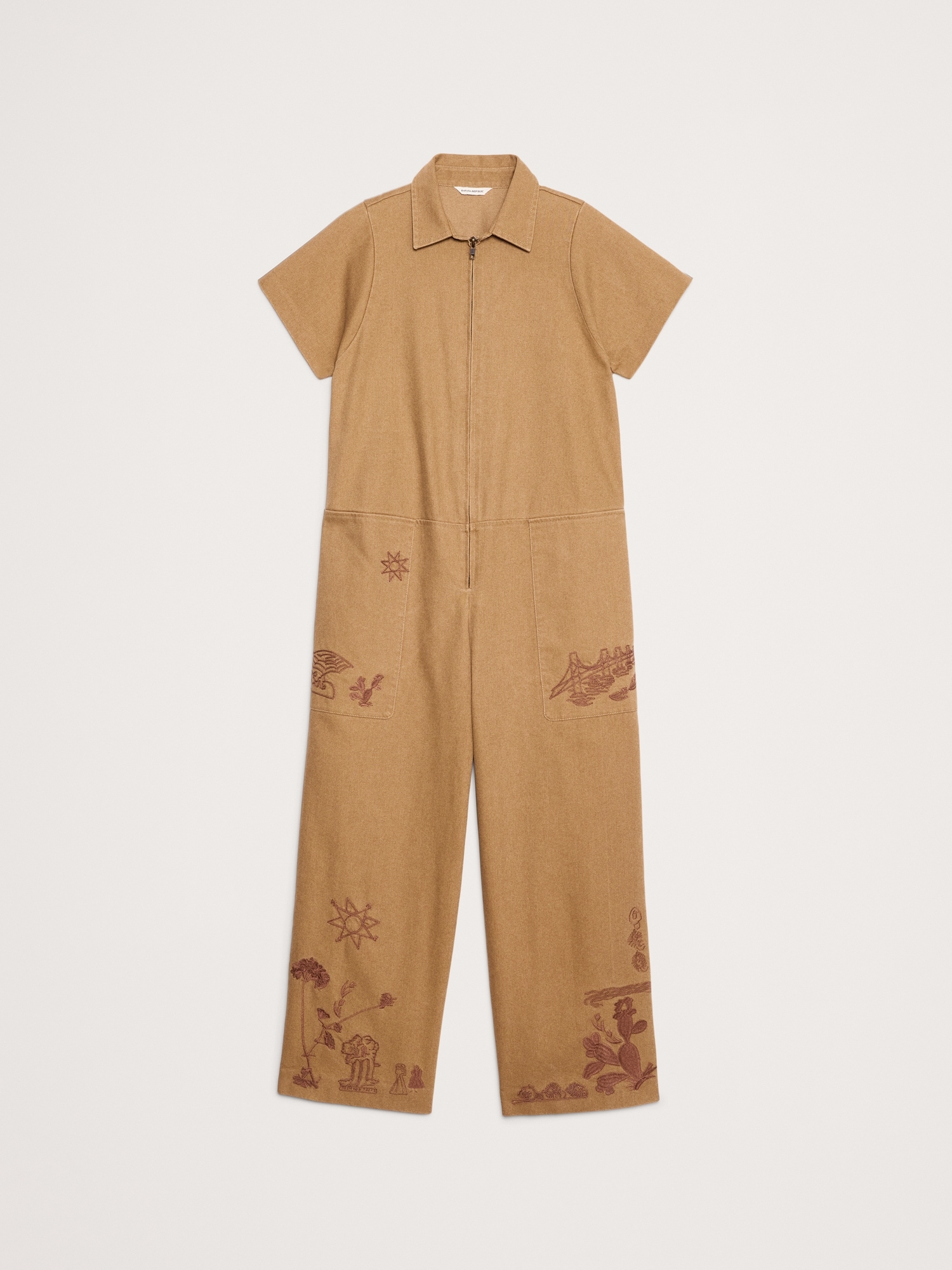 A design love, we cut this utility jumpsuit from sturdy, cotton canvas with a garment wash for softness. Look closely: the embroidery motifs were pulled from a vintage BR scarf of California icons.
