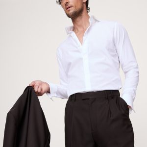 A very cool tuxedo. We kept the fit relaxed for these tuxedo pants, crafting them in a beautiful Italian wool barathea woven for us in Italy by famed Marzotto mill. Here, the fit is relaxed, but never sloppy with a straight leg and pleated front.