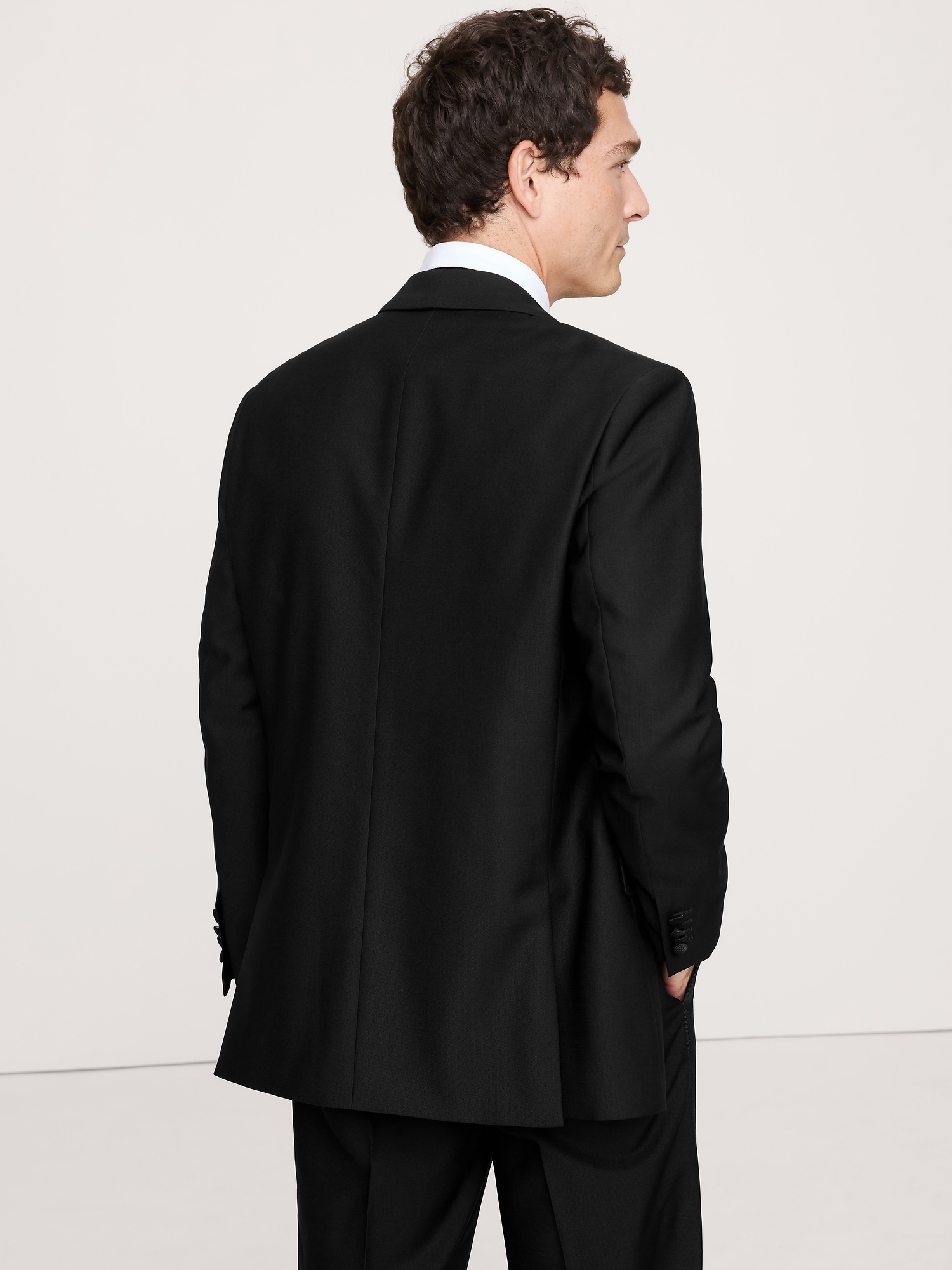 A tuxedo as special as the occasions it’ll see. Note: the Italian wool barathea fabric, the shawl lapel, and the double-breasted front (so it formal).