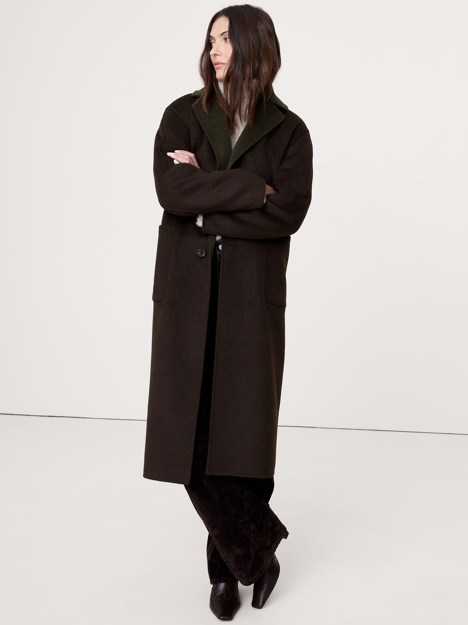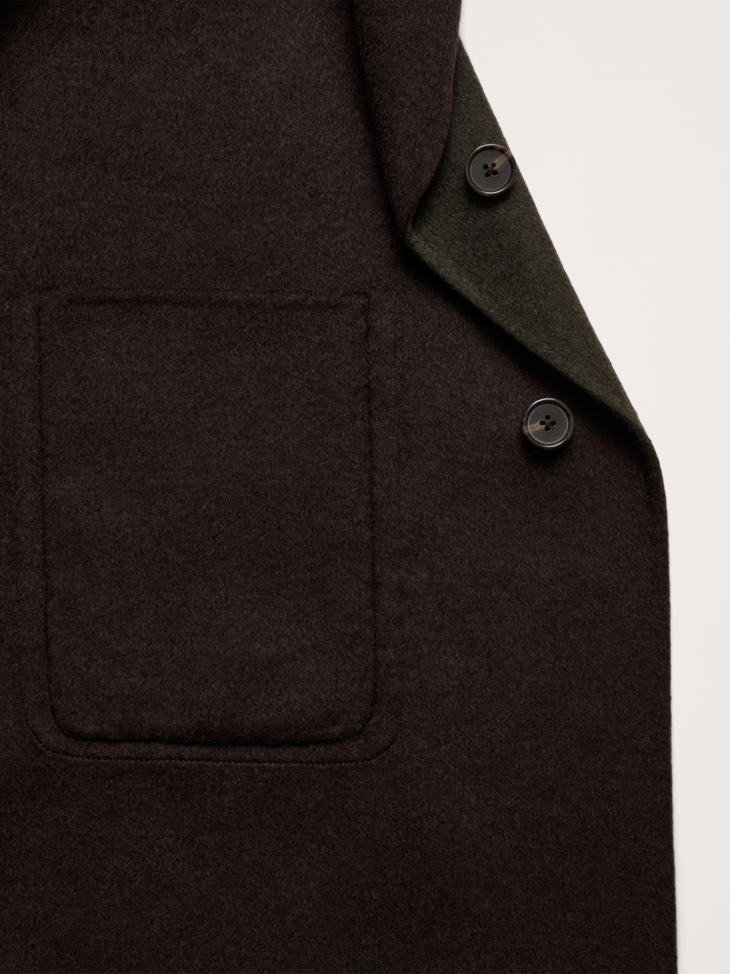 Designed to be layered, this double-breasted topcoat is crafted from our a reversible double-faced wool blend. We cut it with a relaxed fit for easy layering through the coldest months.