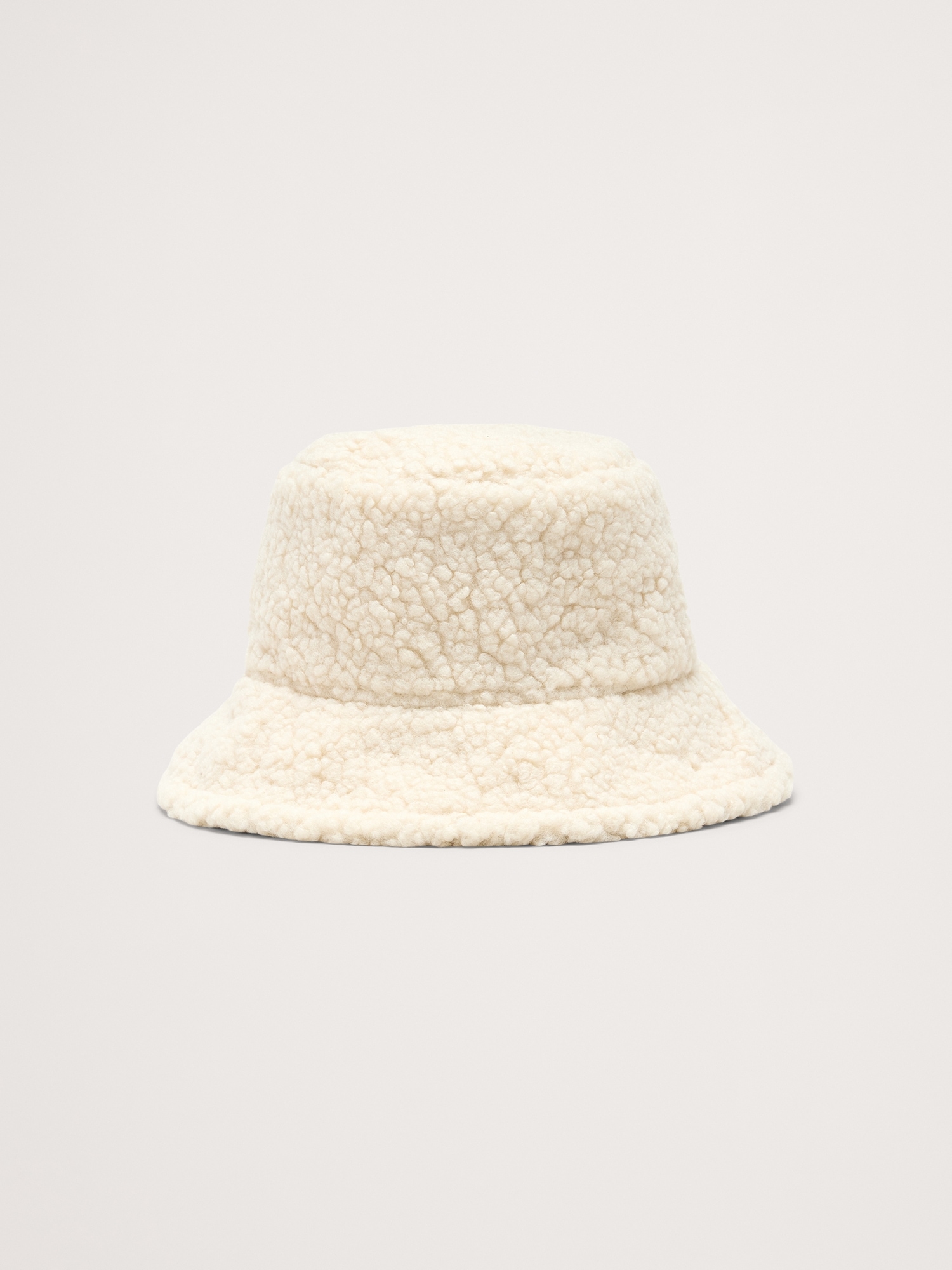 A classic bucket hat, in cold-weather ready sherpa that reverses to sturdy faux-suede.
