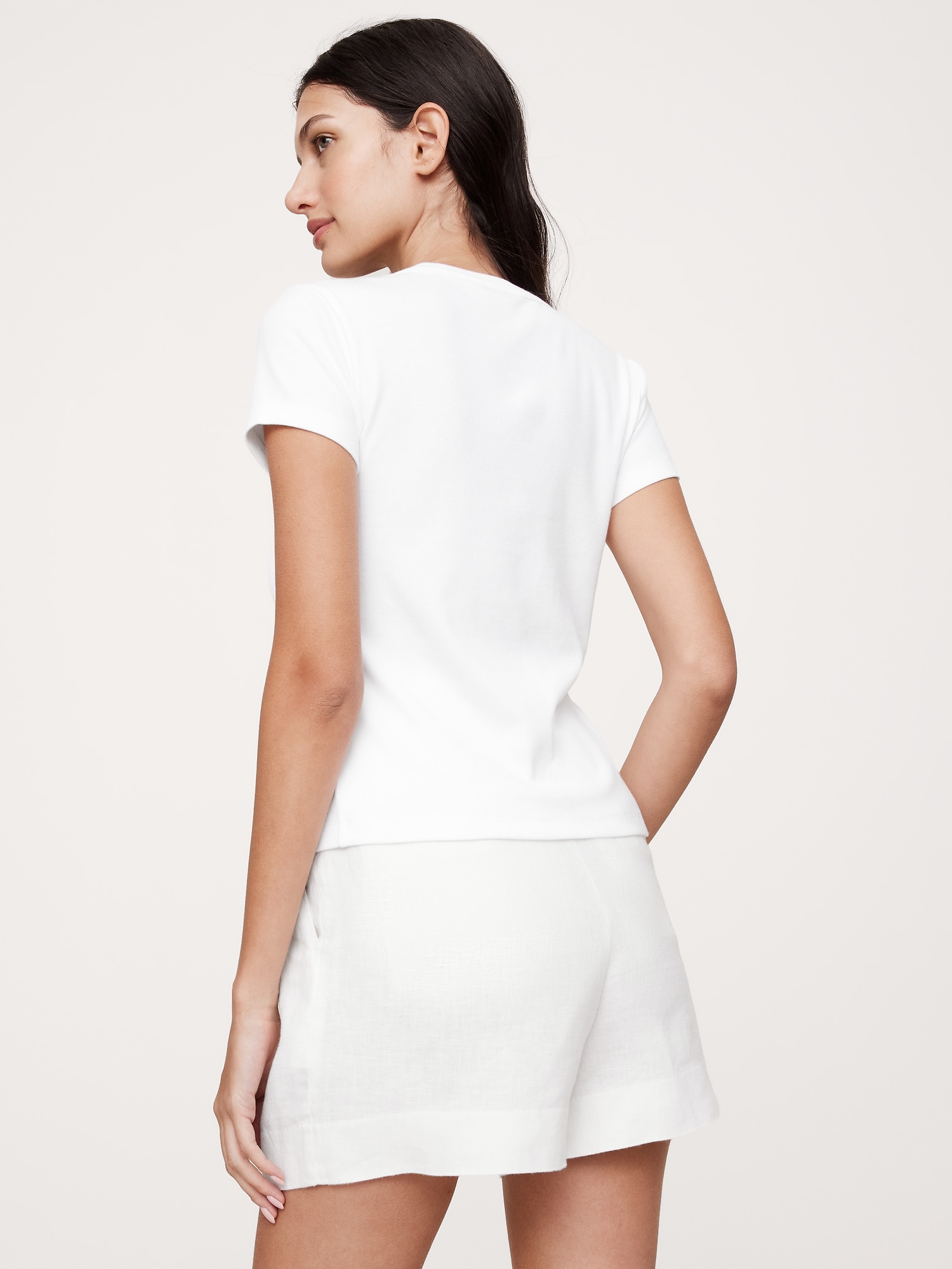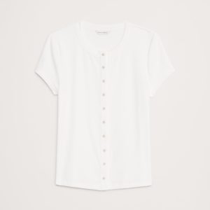 A classic crew-neck tee meets cardigan styling, we kept the fit slim for this Ribbed Top, adding a row of beautiful horn buttons down the front so you can button as high or low as you like.