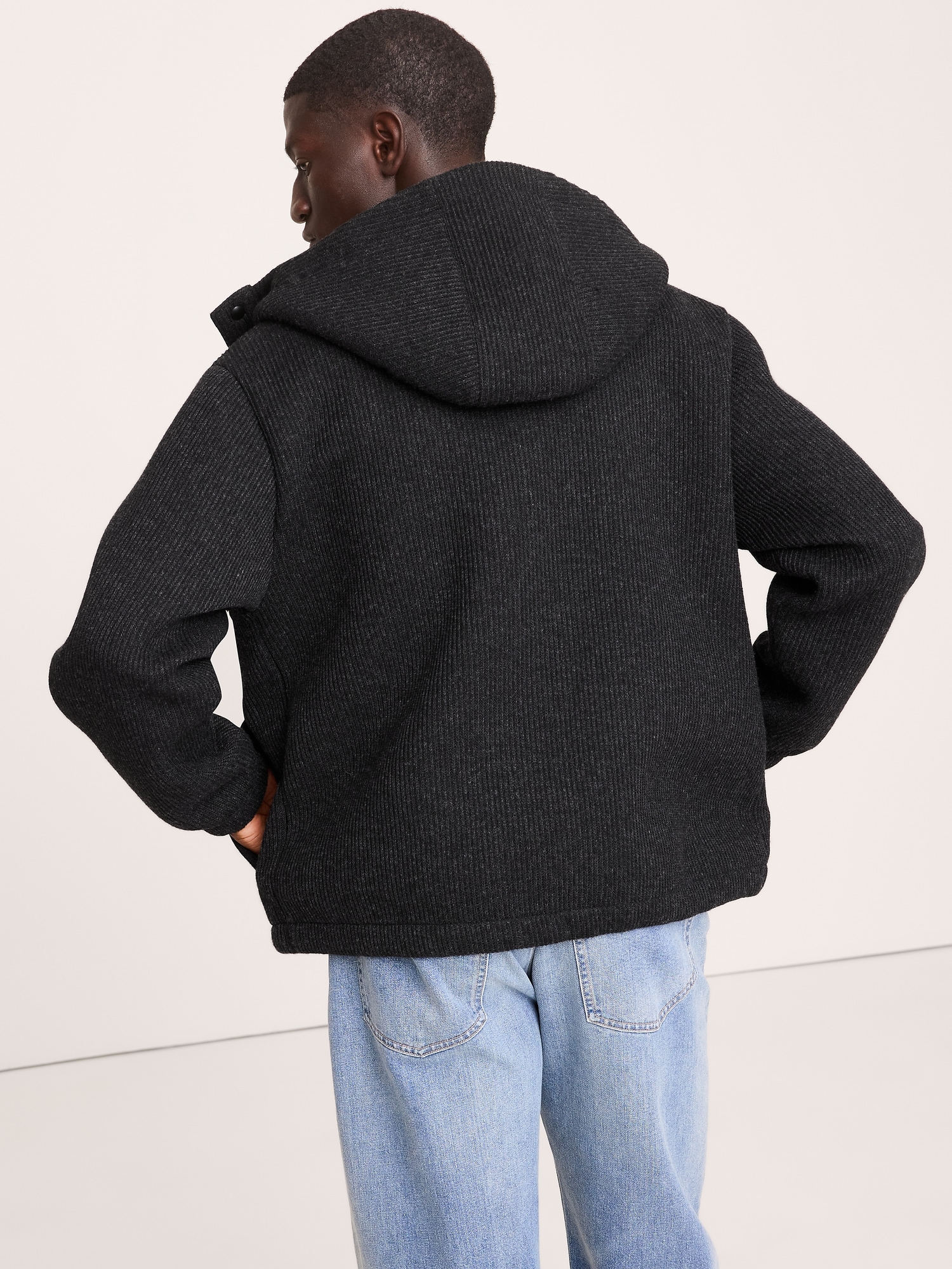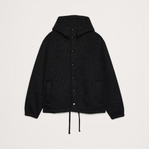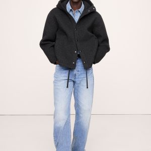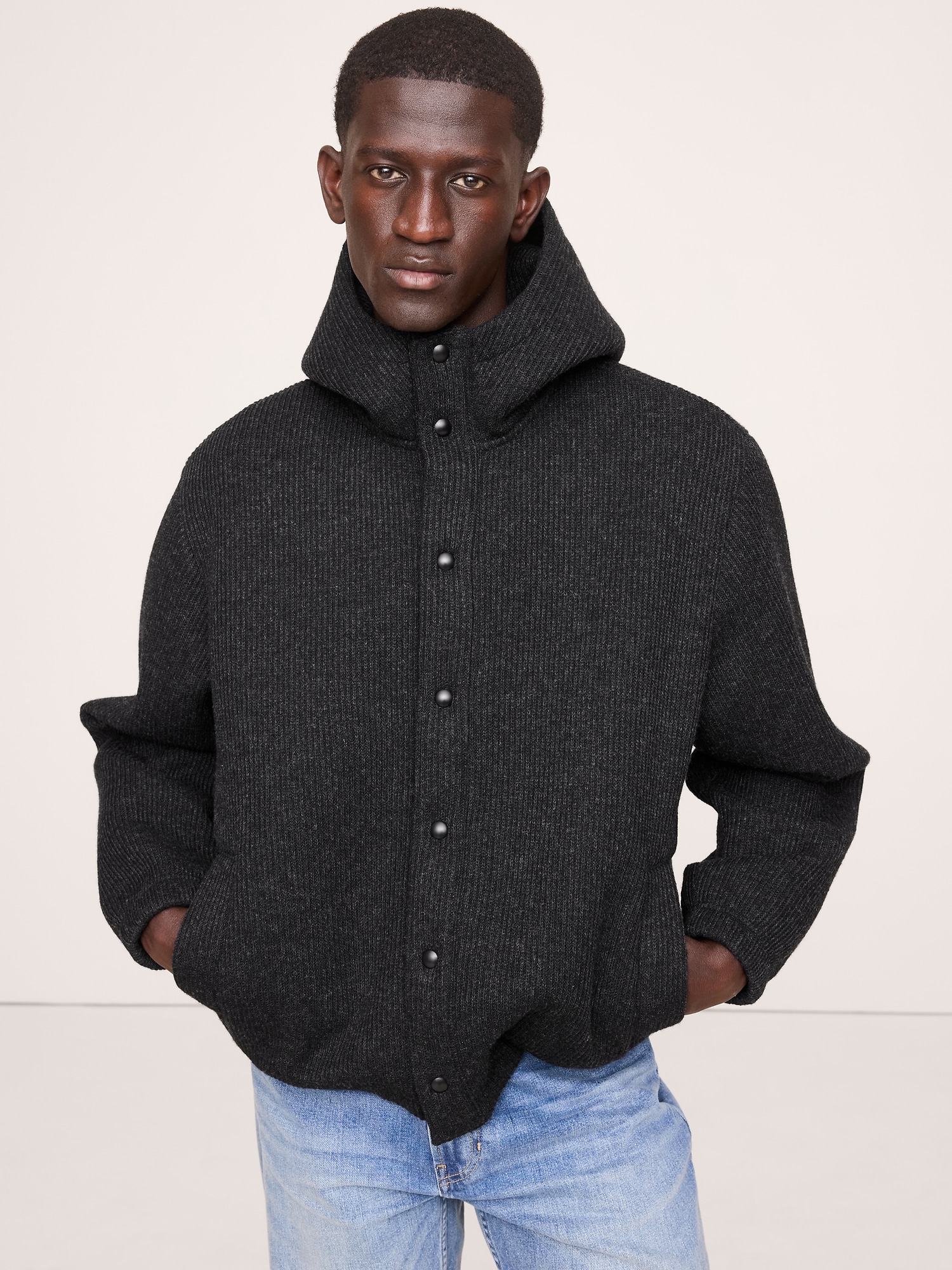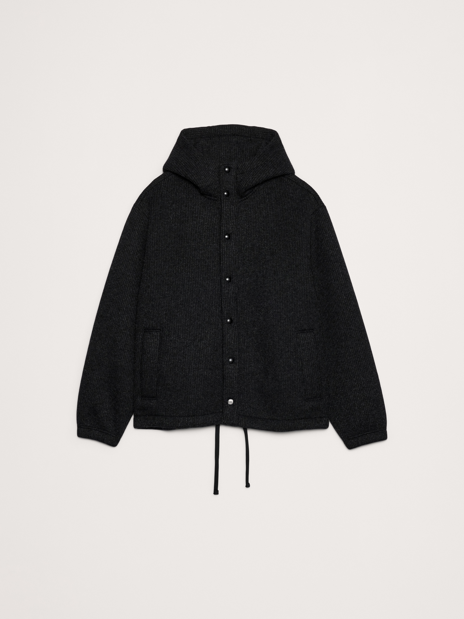 Inspired by vintage stadium jacket, we cut this one in a very cool ribbed scuba fabric woven with a touch of wool for added warmth. Use the drawstring at the hem to exaggerate the blouson silhouette.