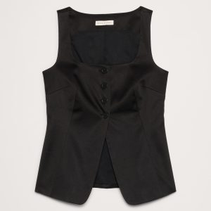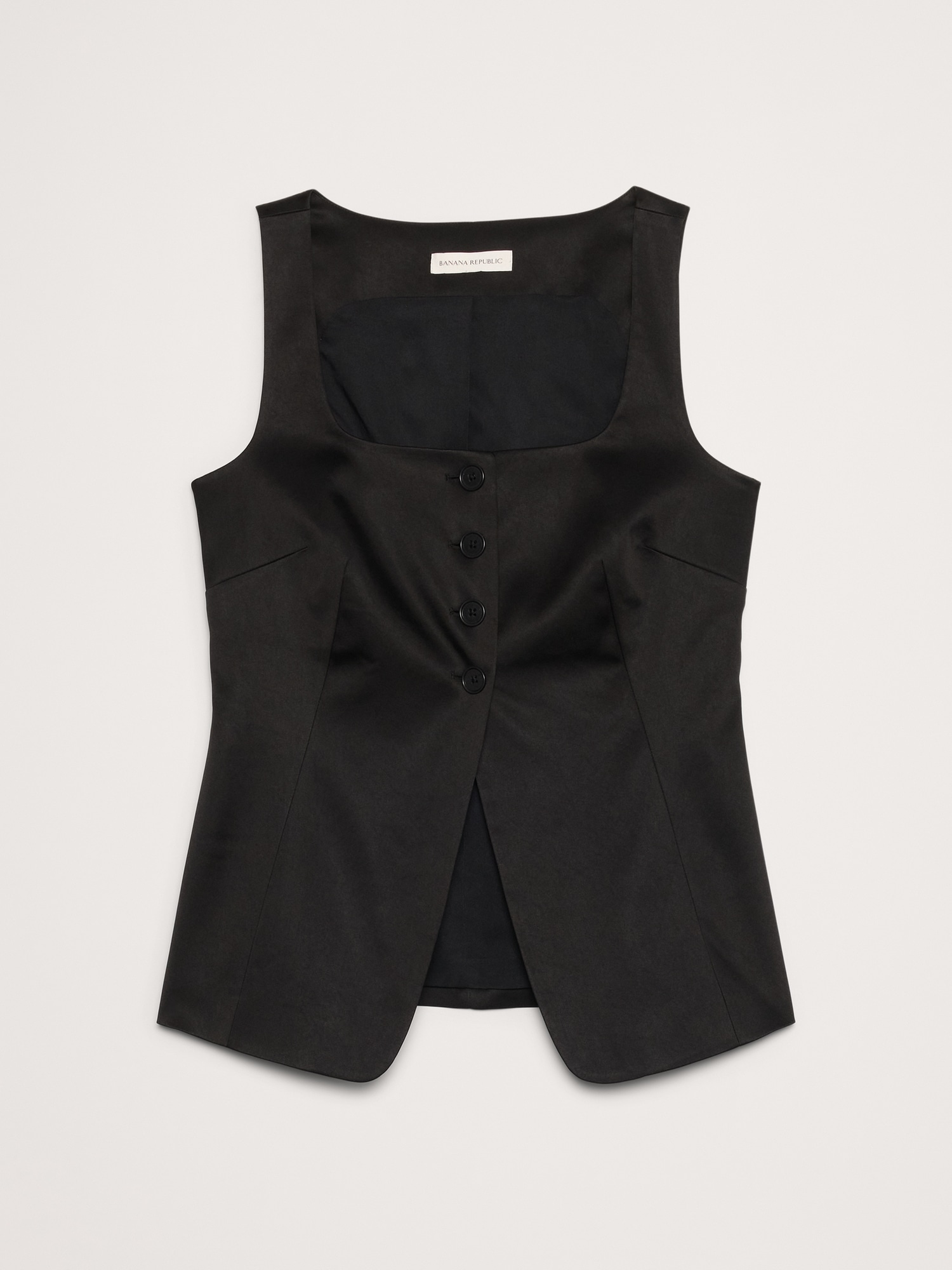 We cut this square-neck vest in a longer length with a square neckline, in a soft satin fabric. Make it a set with the matching kick-flare pant.