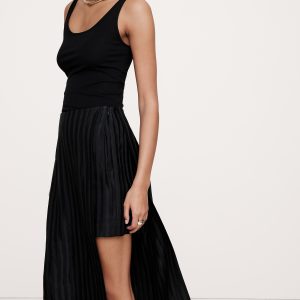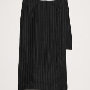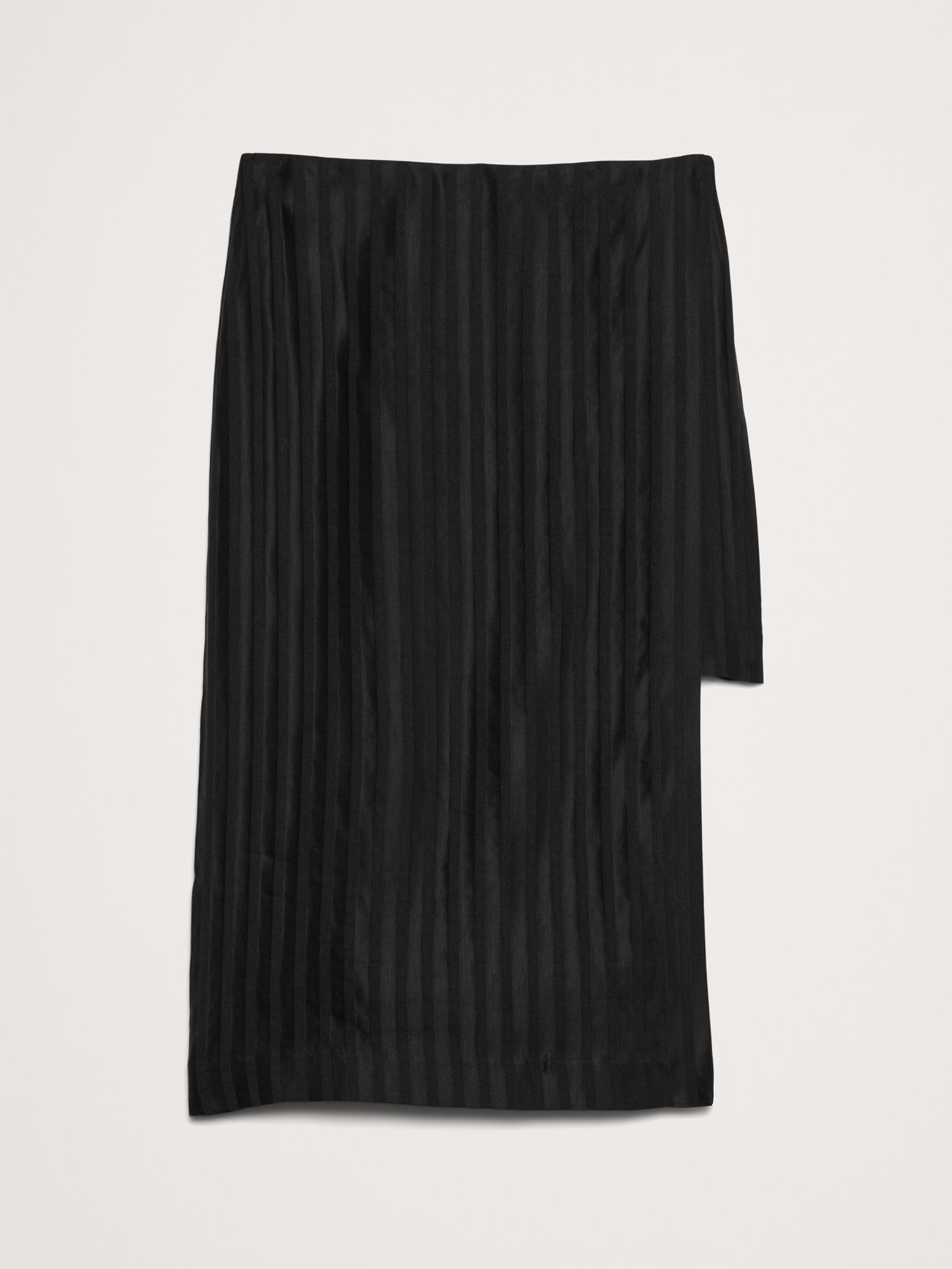 Look closely: the subtle stripes of this asymmetric skirt are woven in opposite directions using an jacquard technique. The effect is a subtly shimmering effect that’s anything but basic black.