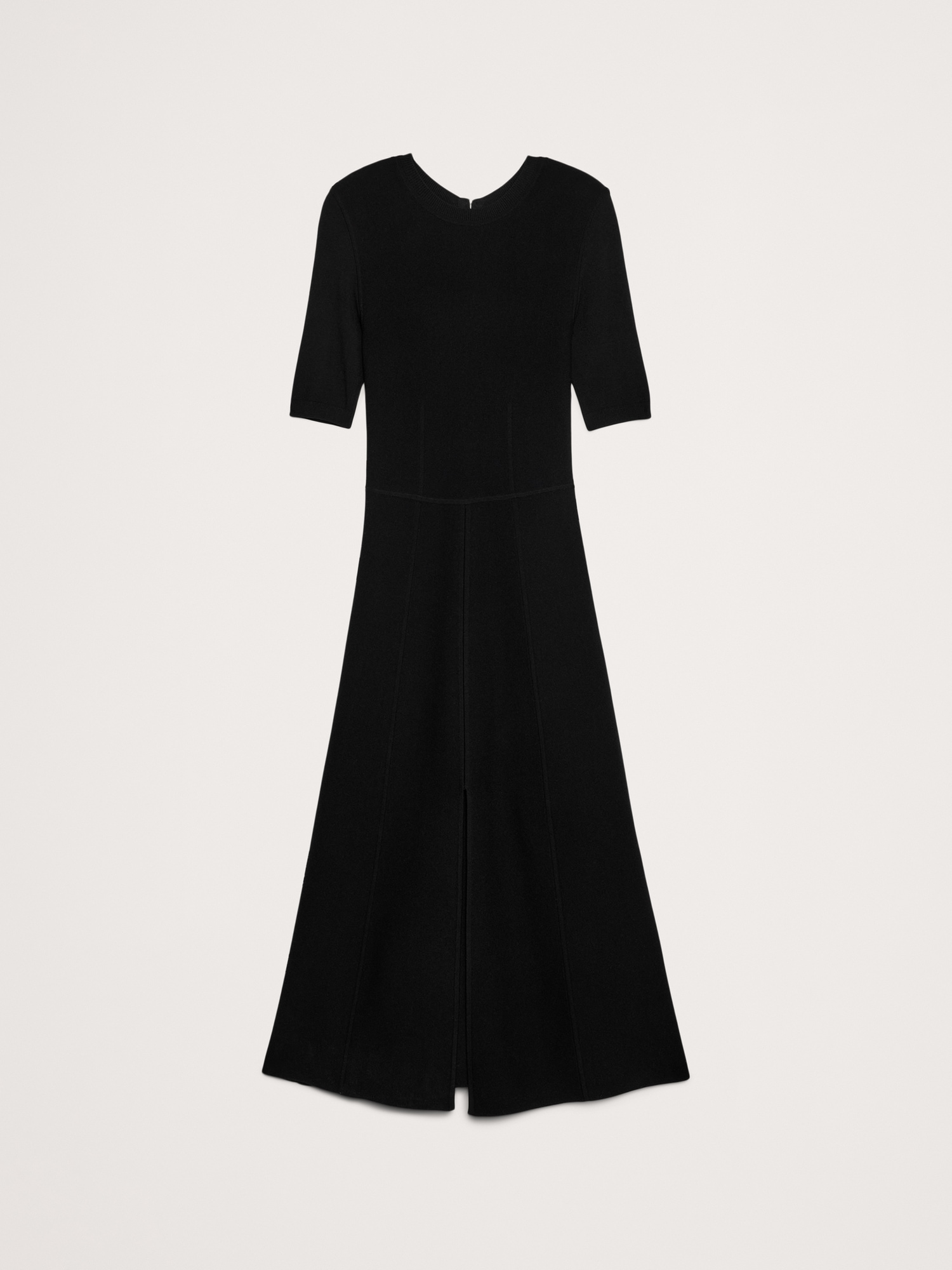 A dress that says \”leave it to me\”. We cut this midi dress in our high-stretch Sculpted yarn, here with a Milano stitch so it lays smooth against the skin.